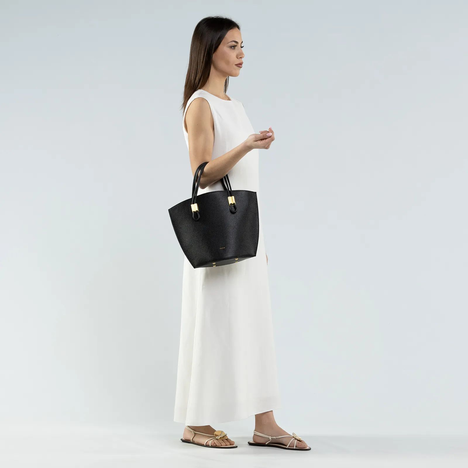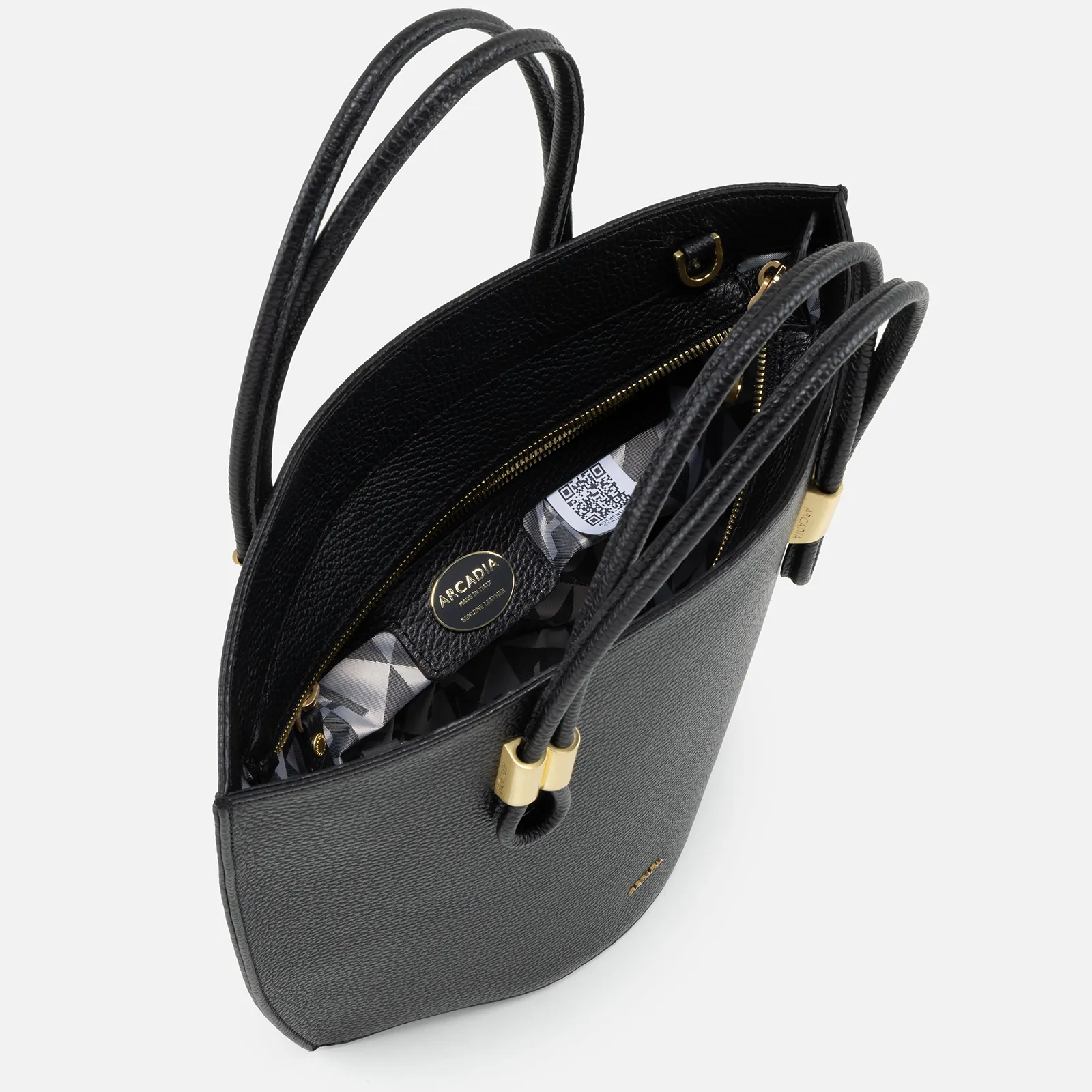 Gekorreld kalfsleer / Gewicht: 1 kg / Handgrepen hangen 14 cm - 5,50 inch / Ritssluiting aan de bovenkant / Binnenzak met rits / Geborstelde hardware / Merkvoering / Afneembare schouderband hangt 60 cm - 23 inch / Beschermende metalen voetjes / Interne metalen plaat Arcadia Made in Italy / Modellengte 5'64” - 172 cm