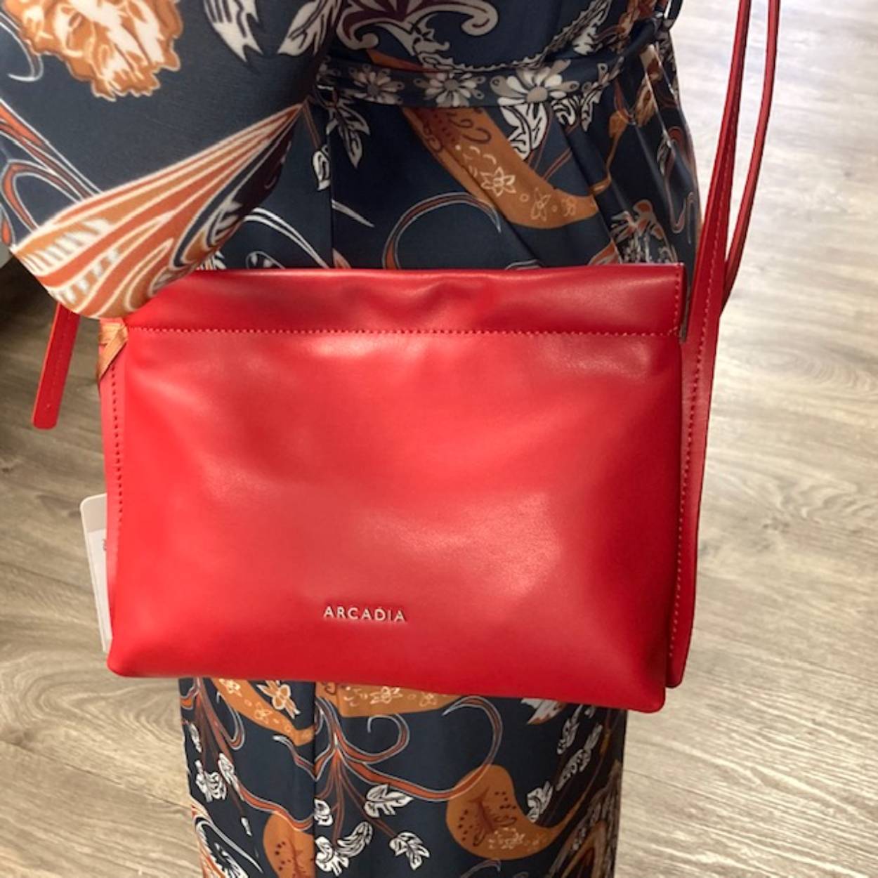 Modische damestas van Arcadia.Schouderband is verstelbaar. Onder de toprits zit 1 hoofdvak en een binnenrits.