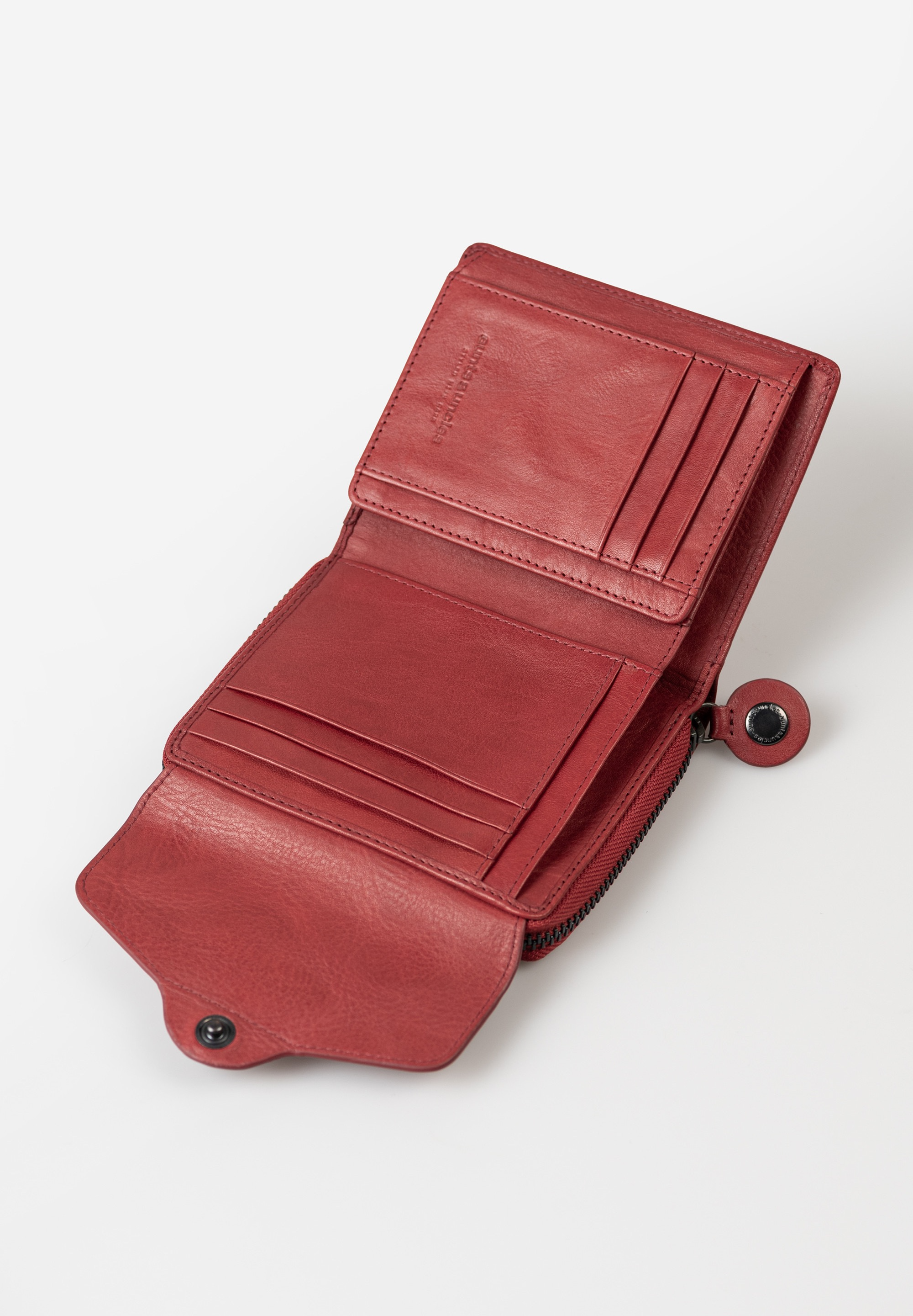 Lesley beschikt over twee ruime hoofdcompartimenten: een opklapbaar vak met drukknoopsluiting en een extra vak met een rondomlopende ritssluiting. Binnenin biedt deze portemonnee 12 kaartsleuven, 5 grote steekvakken (waarvan één transparant – ideaal voor ID-kaarten of foto's), een onderverdeeld muntvak, én een onderverdeeld vak voor papiergeld.