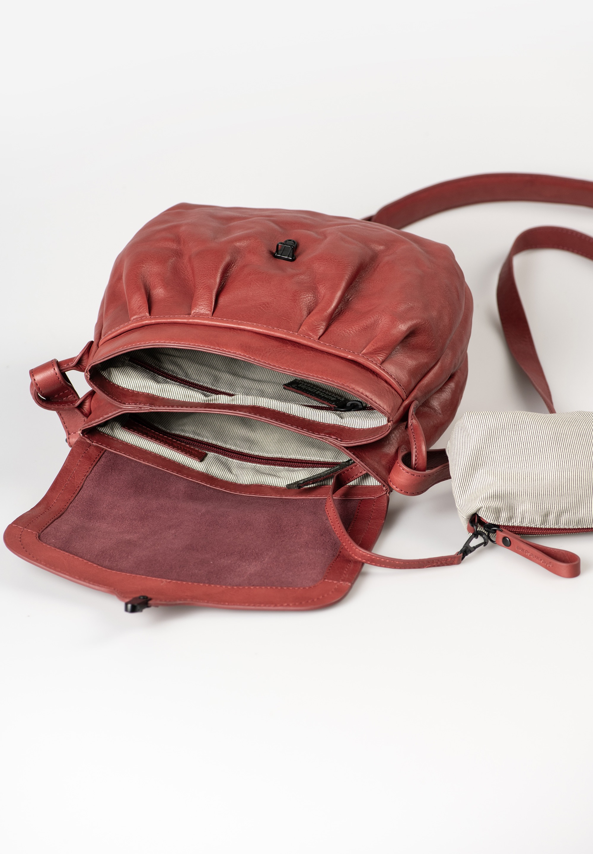 Onder de overslag vind je een tweedelig hoofdvak en een ruim voorvak. Met extra binnenvakken, een sleutelriem en een uitneembaar stoffen etui blijven je essentials altijd netjes geordend. Het ritsvak aan de achterkant is extra beveiligd met een drukknop. Het zachte schouderpad zorgt voor een comfortabel draaggevoel, ook bij langere dagen.