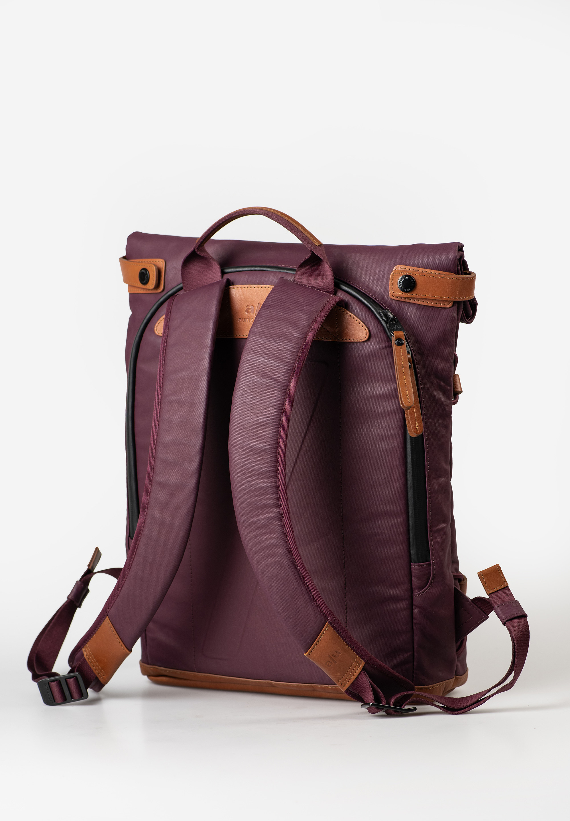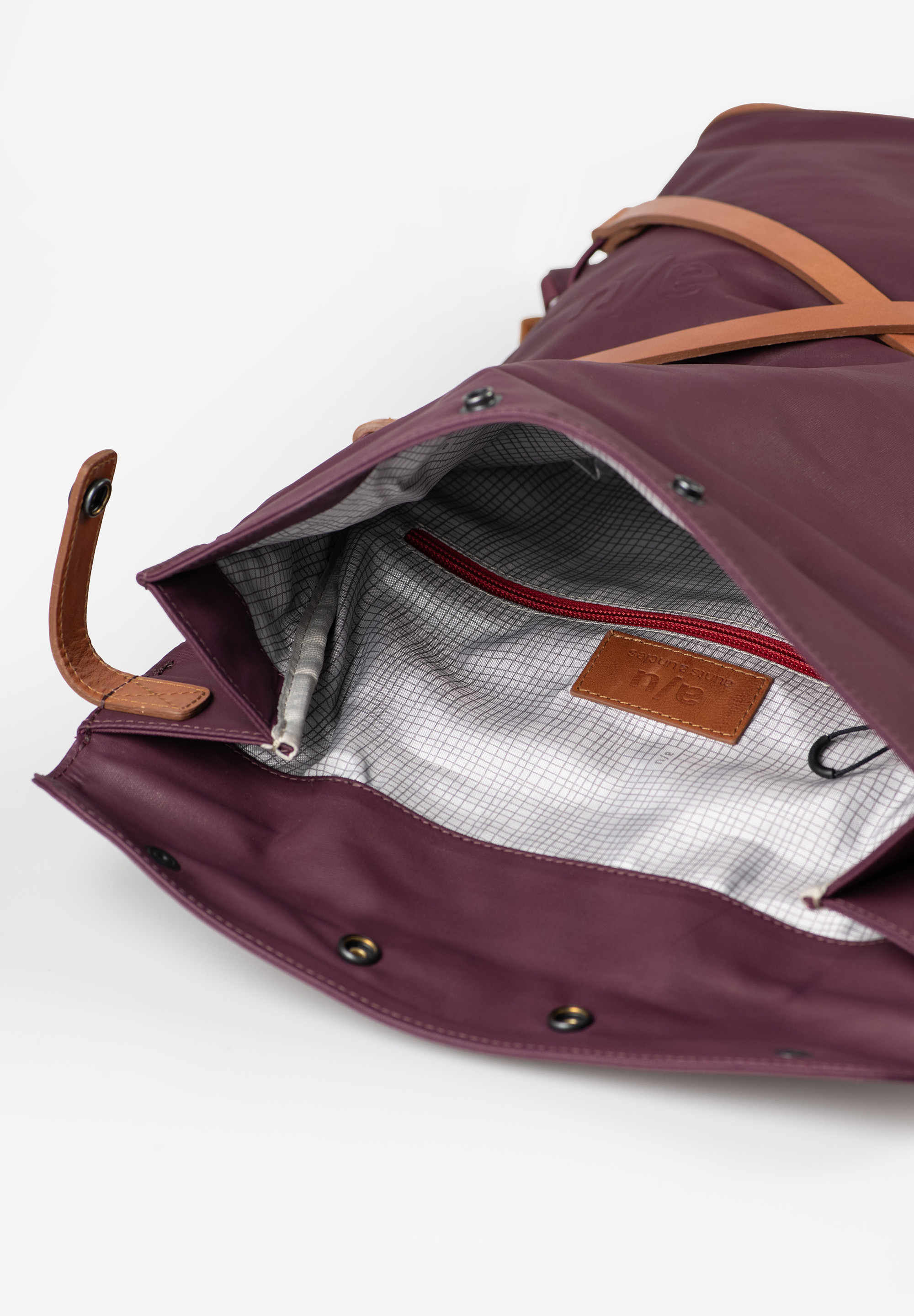 De canvas van de Japan-collectie bestaat uit biologisch katoen dat dicht is geweven en afgewerkt met een semi-glanzende, PFAS-vrije coating. Deze coating maakt het materiaal waterafstotend en geeft de rugzak een unieke, leerachtige uitstraling. Regenbestendige ritsen en lederen details maken het ontwerp compleet en duurzaam.