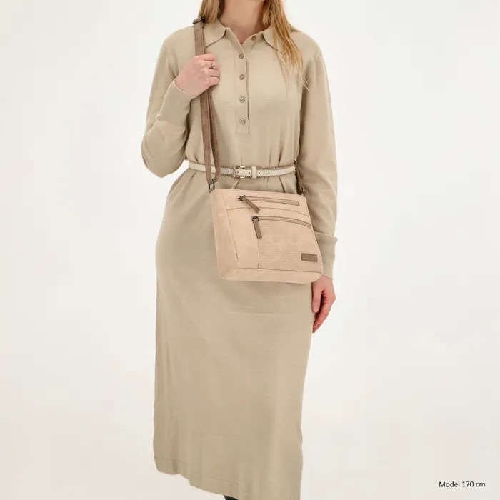 De tas beschikt over een ruim hoofdvak dat veilig afsluit met een ritssluiting. Daarnaast zijn er extra voorvakken, een achtervak met rits en handige insteekvakken binnenin – ideaal om je sleutels, telefoon en andere essentials overzichtelijk op te bergen.