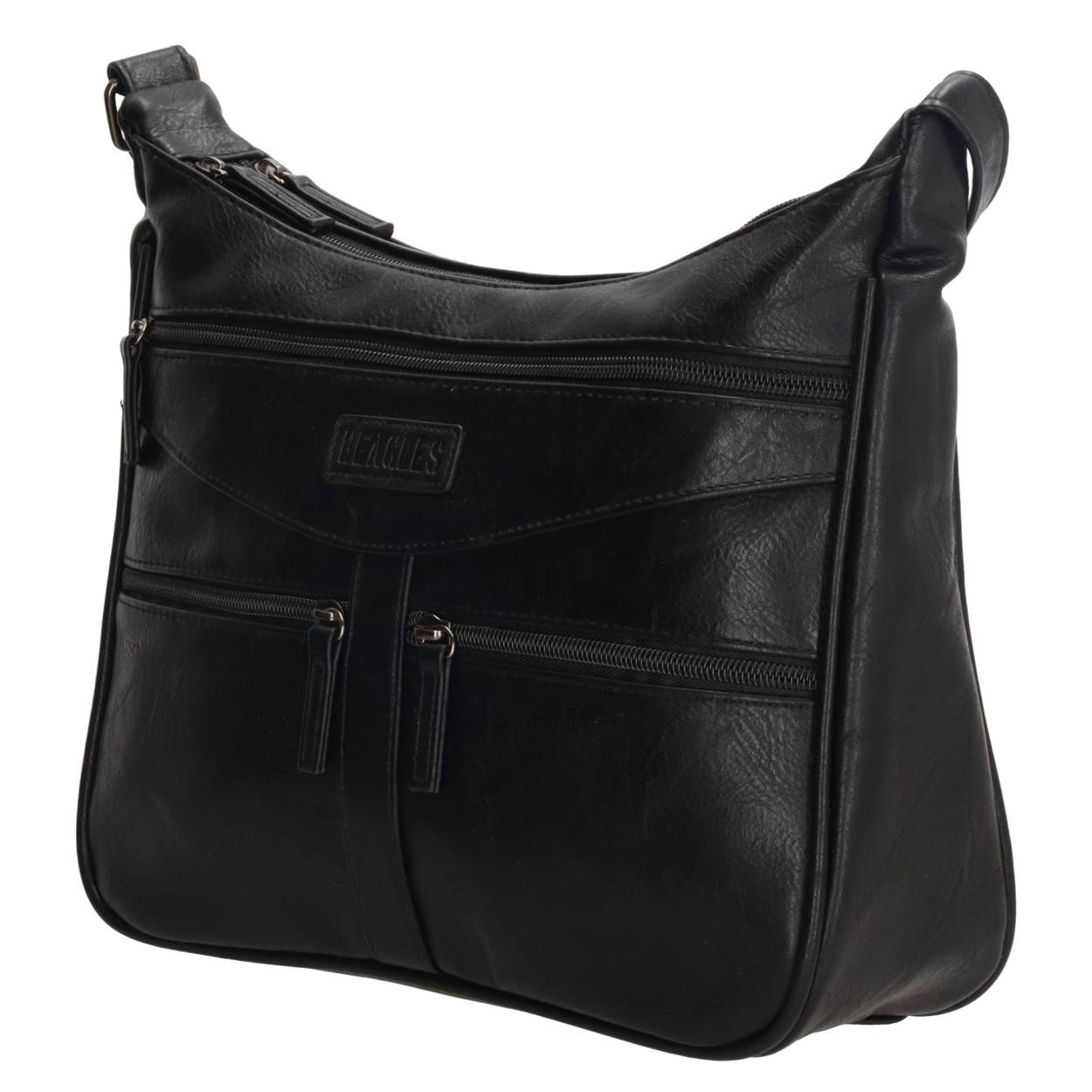 Op zoek naar je nieuwe favoriete schoudertas? Misschien is dit 'm wel! Deze schoudertas van het merk Beagles is ideaal in gebruik door de verschillende vakken die de tas heeft. De tas heeft op de voorzijde namelijk drie ritsvakken, twee hoofdvakken met ritssluiting en op de achterzijde nóg een ritsvak! In het hoofdvak bevindt zich ook nog eens een ritsvakje. Je draagt de tas gemakkelijk aan de verstelbare schouderband. Ga jij op pad met deze mooie schoudertas bij je?