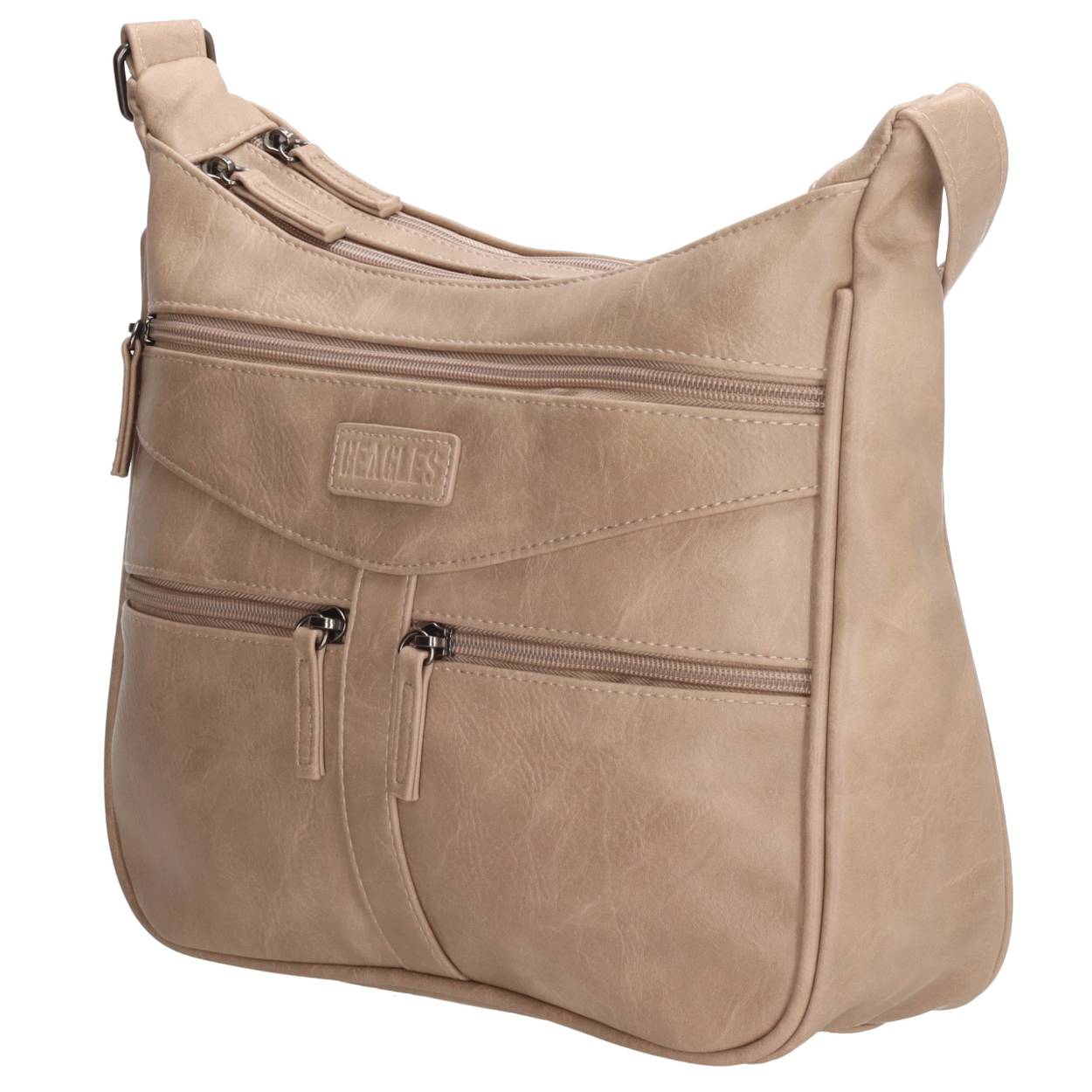 Op zoek naar je nieuwe favoriete schoudertas? Misschien is dit 'm wel! Deze schoudertas van het merk Beagles is ideaal in gebruik door de verschillende vakken die de tas heeft. De tas heeft op de voorzijde namelijk drie ritsvakken, twee hoofdvakken met ritssluiting en op de achterzijde nóg een ritsvak! In het hoofdvak bevindt zich ook nog eens een ritsvakje. Je draagt de tas gemakkelijk aan de verstelbare schouderband. Ga jij op pad met deze mooie schoudertas bij je?
