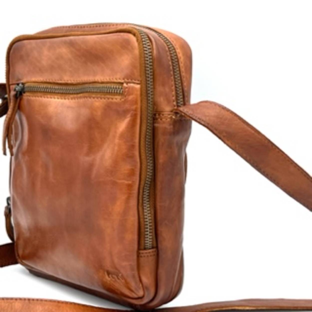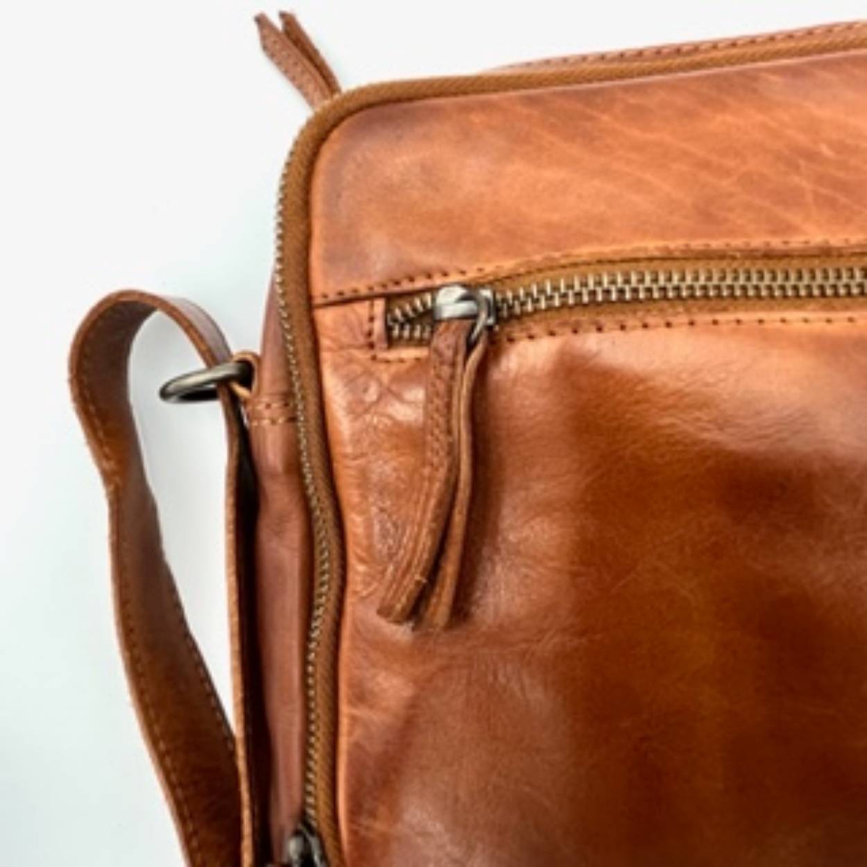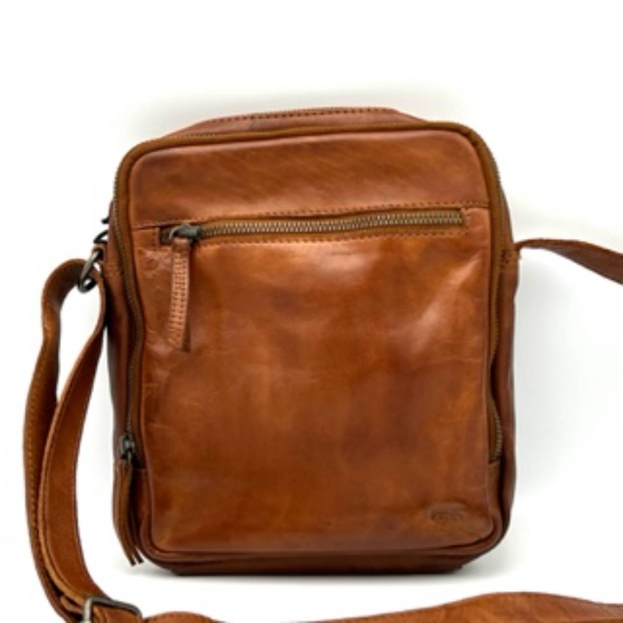 Deze leren tas heeft twee basis vakken met beide nog een vak aan de binnenkant en een verstelbare schouderband. Ook heeft het aan de voor en achterkant nog een vak.