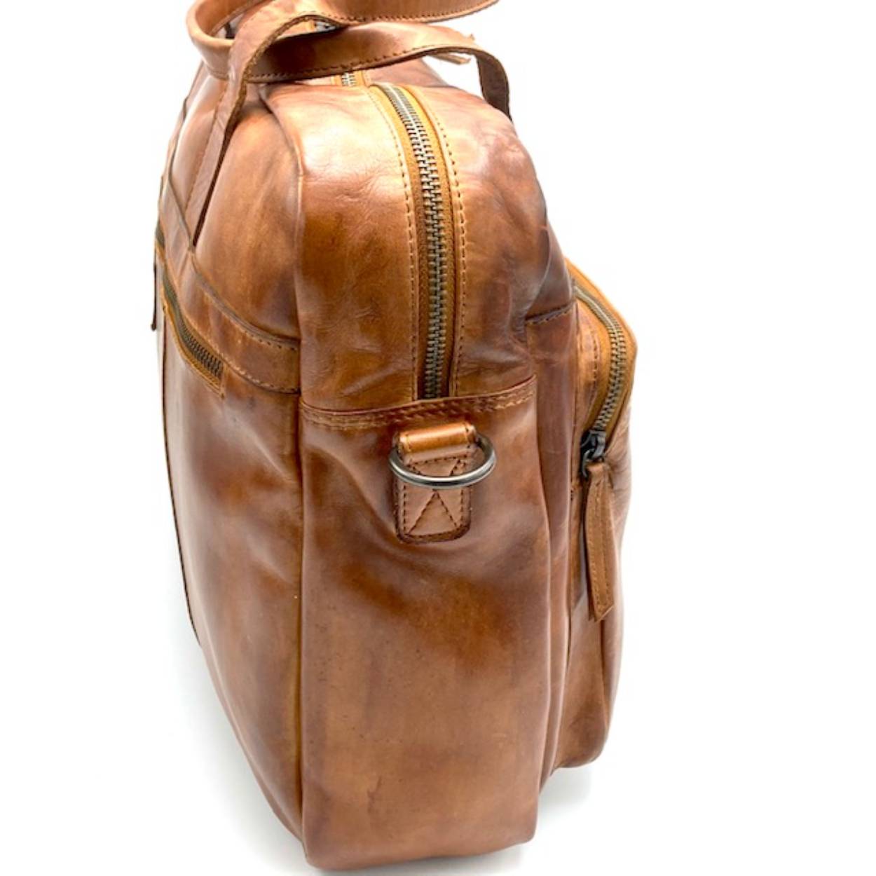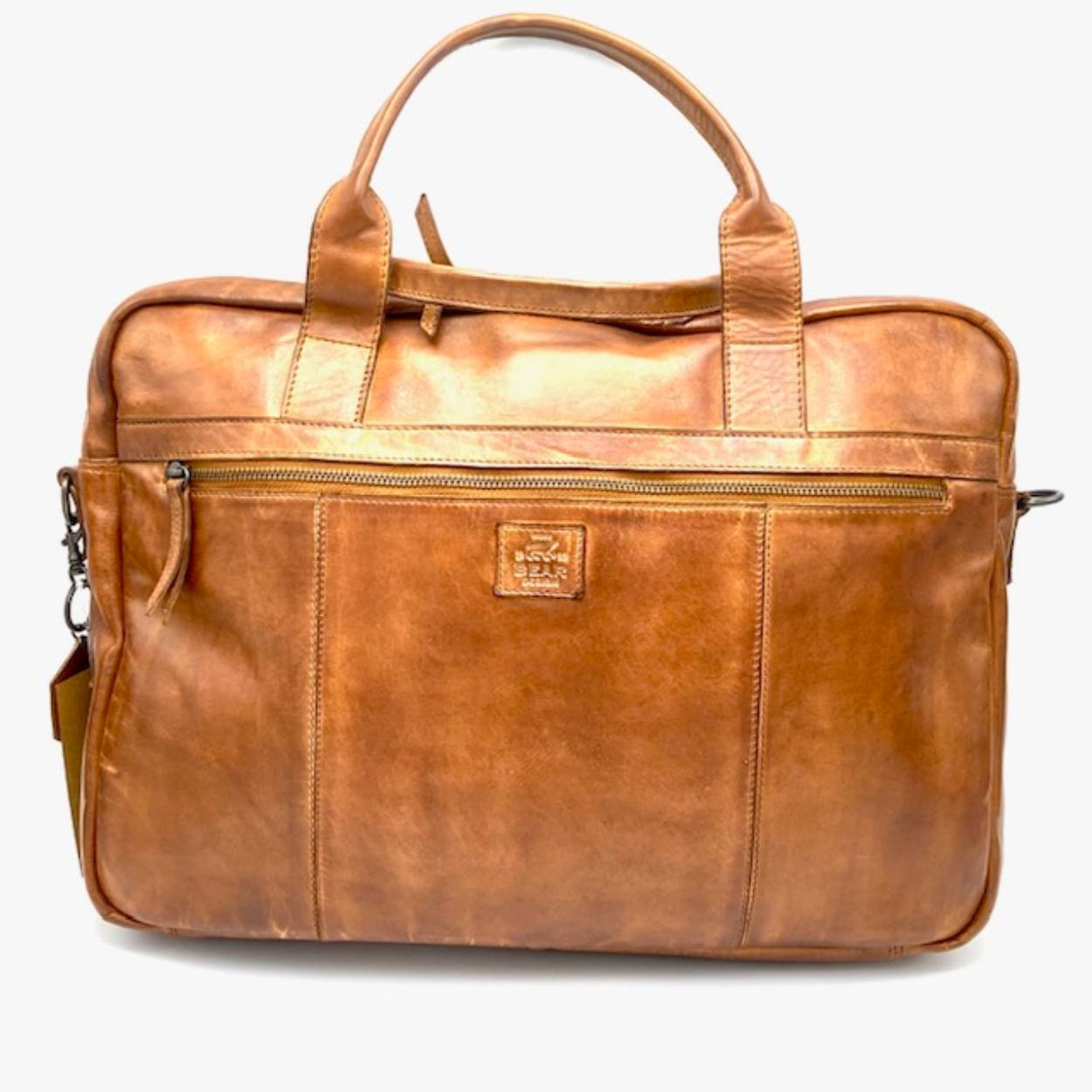 Mooie werktas in soepel stoer cognac leder. De tas is te dragen met twee handgrepen of een lange verstelbare schouderriem. Aan de voorzijde een extra vak voor pasjes, pennen, mobiel op te bergen.