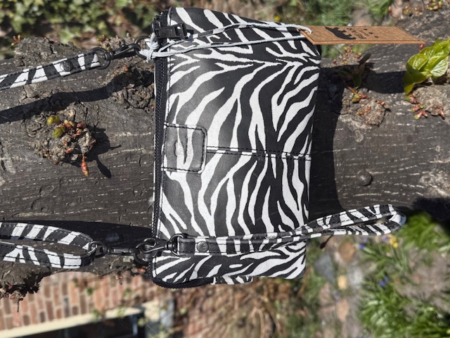 Een schoudertas welke ook als grote Clutch/portemonnee kan worden gebruikt. Onder de toprits bevinden zich drie vakken waarvan het middelste vak is uitgerust om ook pasjes in op te bergen. Verder is het tasjes voorzien van een lange afneembare schouderriem en een afneembaar polsbandje. Afmetingen: Hoogte 14cm x breed 22cm x diep 5cm