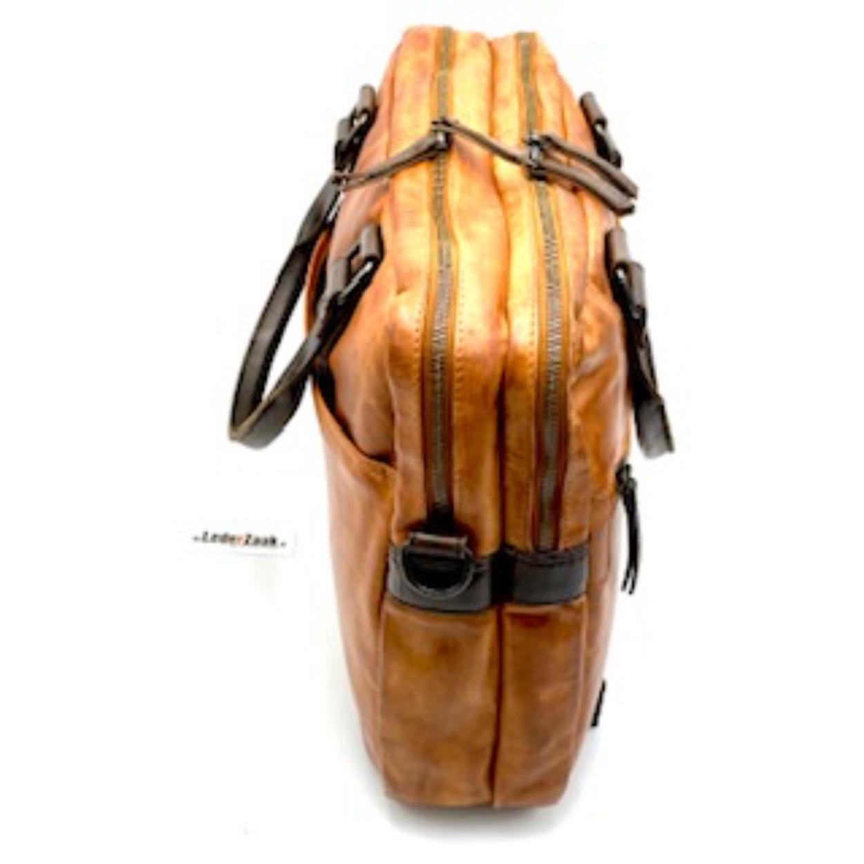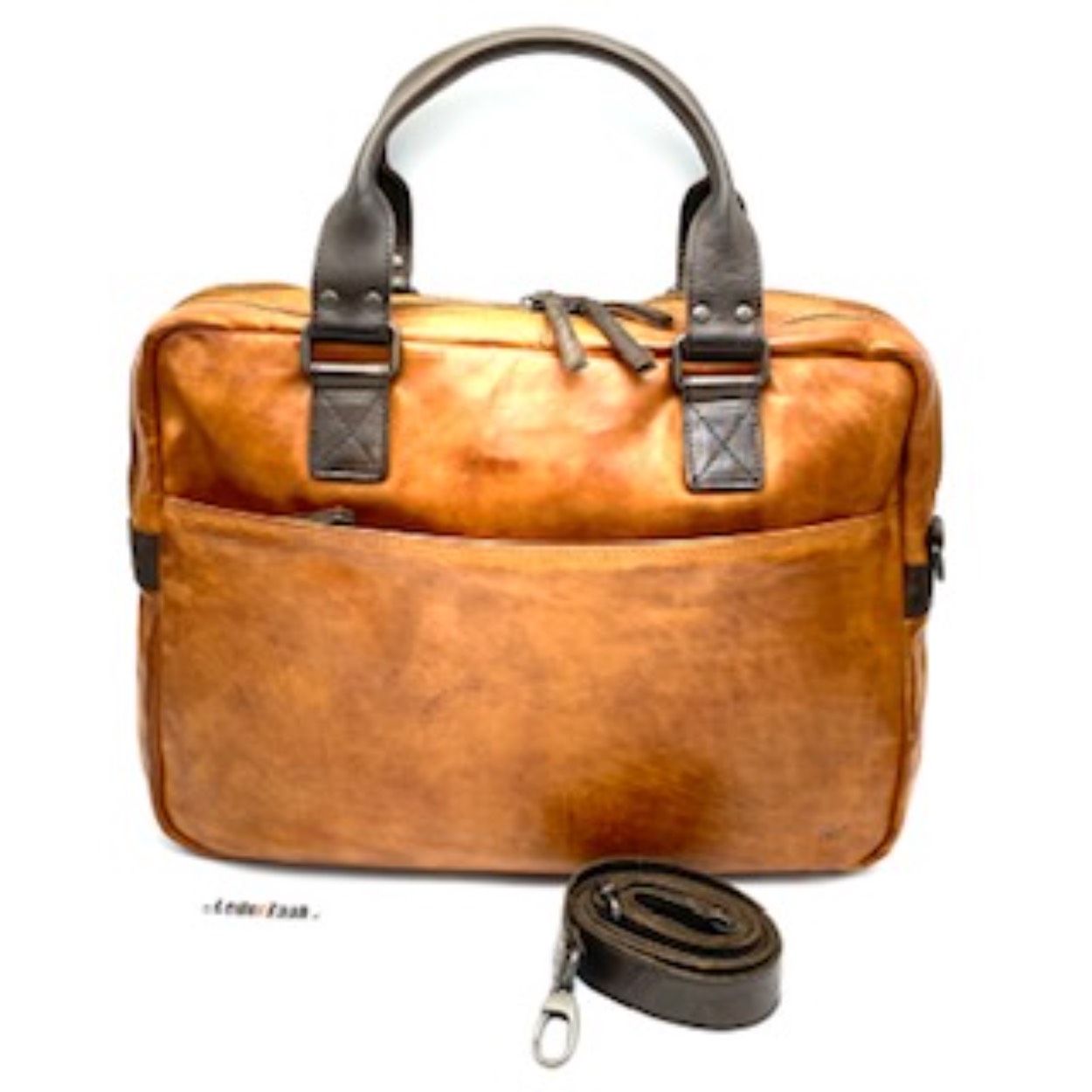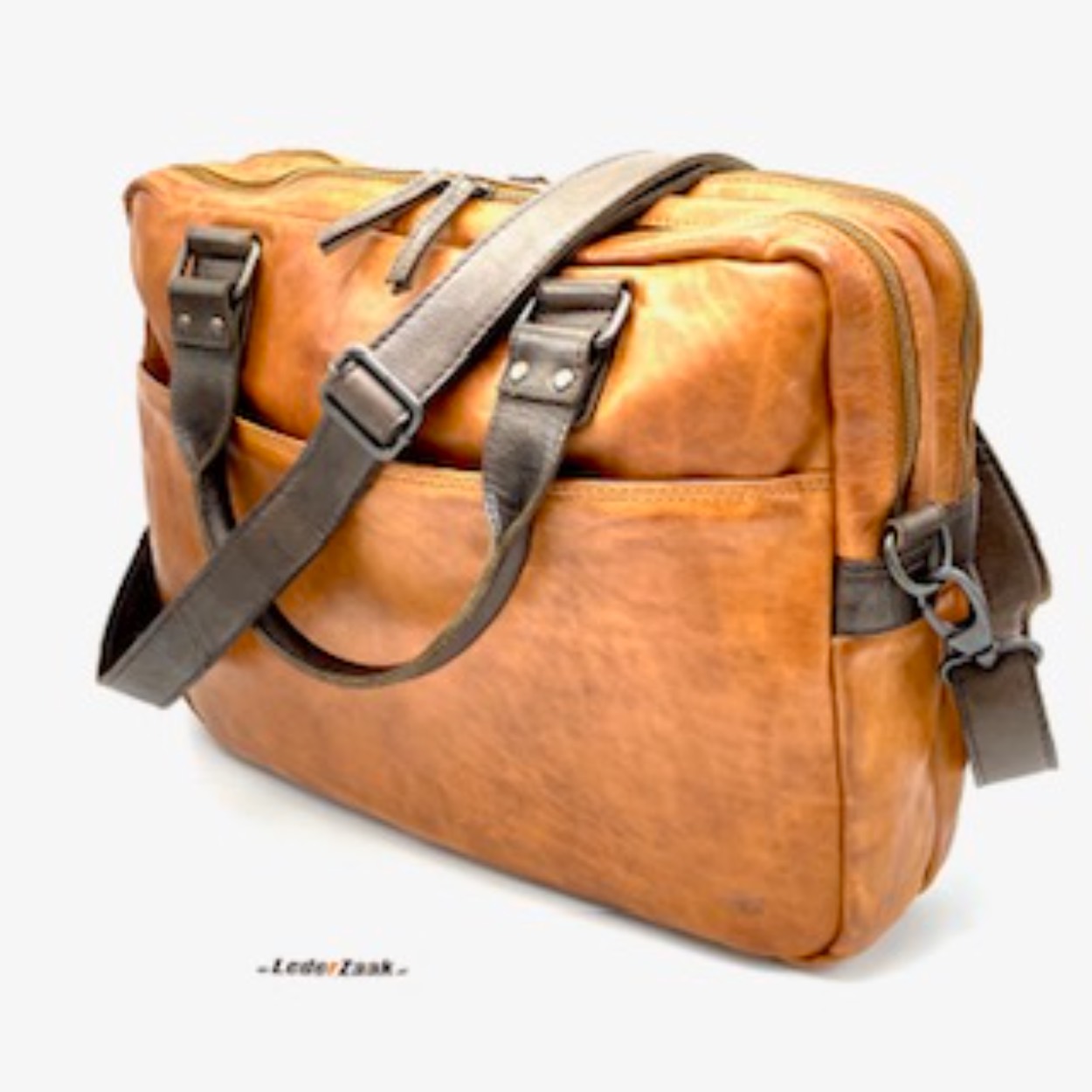 A 4 werktas voorzien van twee ritsen. Korte handgreep en lange schouderriem.