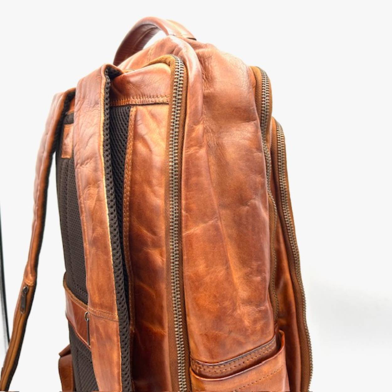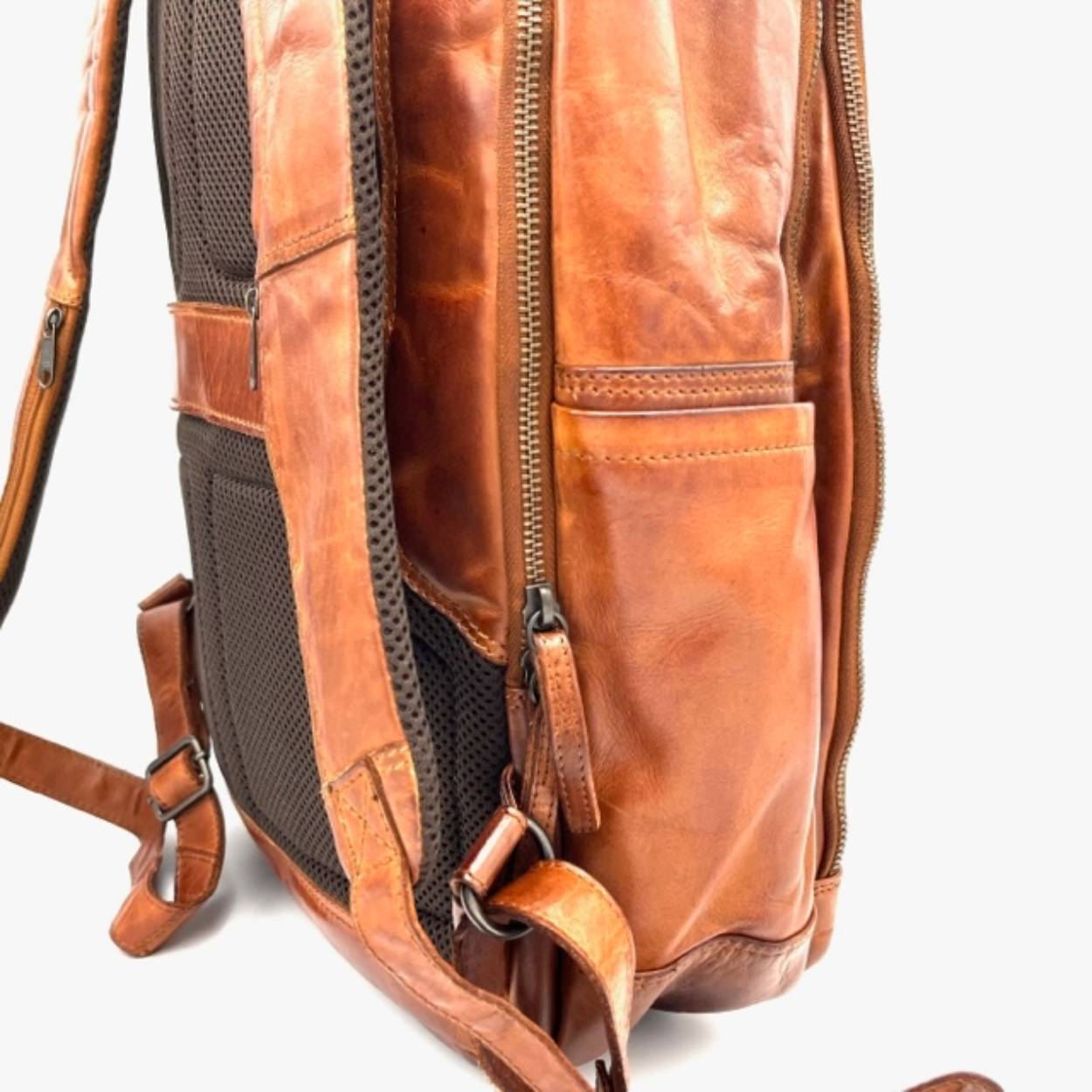 Ruime lederen rugtas met veel opbergmogelijkheden.