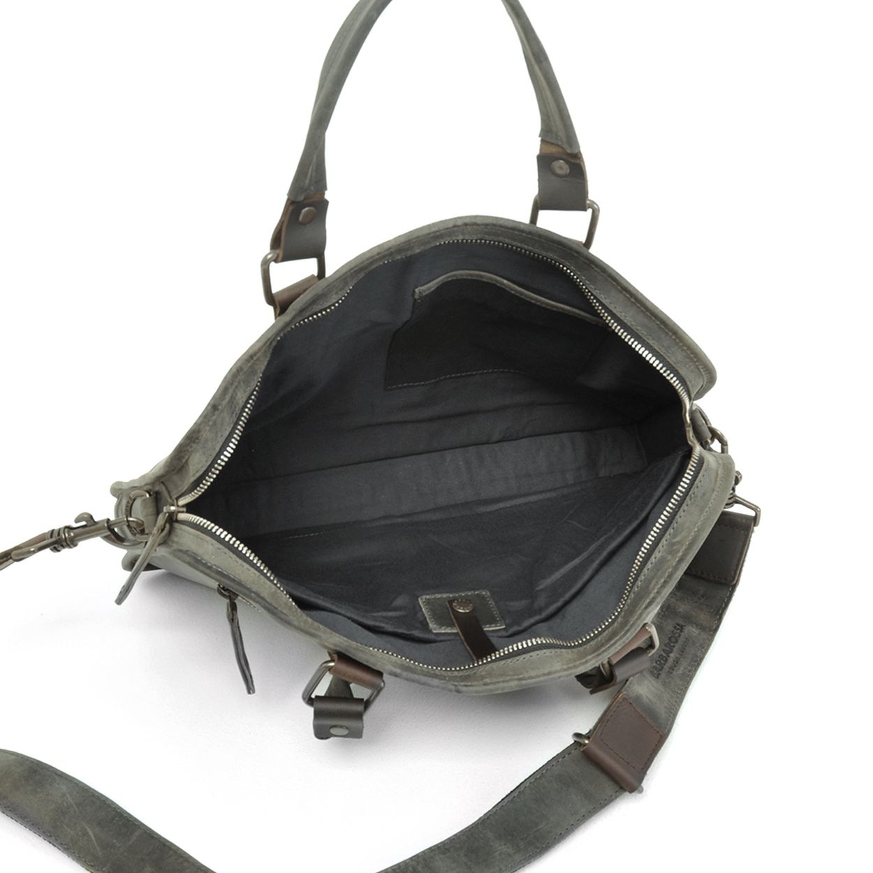Less is more. Deze slanke, functionele en doelbewuste tas doet precies datgene wat je verwacht: je tablet, documenten en andere spulletjes vervoeren en dat op een bijzonder stijlvolle manier. Behalve aan de twee handvatten kun je de tas comfortabel crossbody dragen d.m.v. de bijgeleverde brede schouderband. Ideaal voor bijvoorbeeld op de fiets of in het OV. Het hoofdvak heeft een verstevigd vak voor je tablet of kleine laptop. Verder is er genoeg ruimte voor A4 documenten en heeft de slanke tas een handig ritsvak aan de achterkant. Het fijne voorvakje waarin je telefoon zijn plek vindt sluit je stijlvol met een bruin lederen riempje. Het bruine tuigleder van de details contrasteren heel gaaf tegen de speciale �military� kleur waarin deze tas is uitgevoerd.