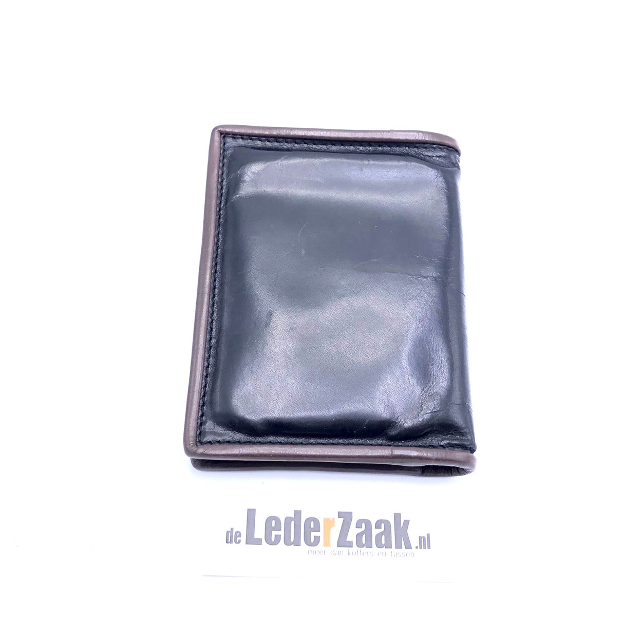 Dit zachte leren pasjesmapje is zwart met een donkerbruin (dadelkleur) randje.