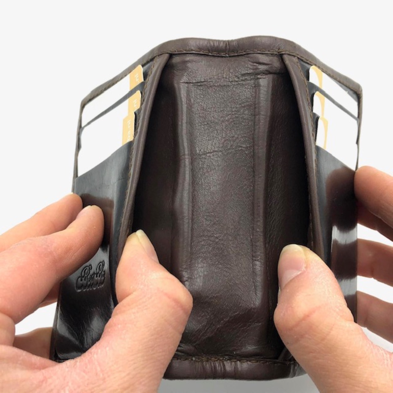 Aan beide kanten ruimte voor ten minste 3 pasjes, en een mogelijkheid een plastic insteekmapje voor pasjes toe te voegen.