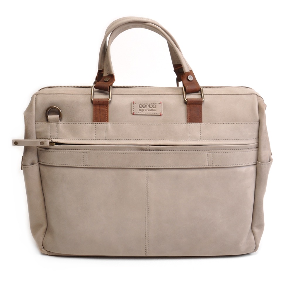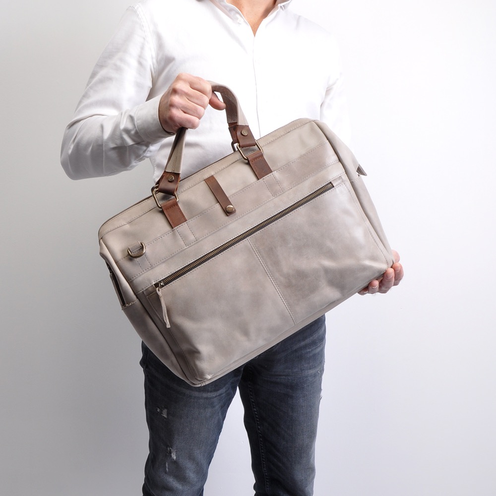 Deze nieuwe en praktische laptoptas heeft een uniek systeem waardoor de tas extra wijd opent. Dit komt door de toepassing van een innovatieve ritssluiting met beugel, vergelijkbaar met de ouderwetse dokterstas. Hierdoor is de tas extra overzichtelijk als je hem opent en bovendien staat de tas als een huis, open of dicht. De voorzijde is prachtig sober ontworpen, wat niet wil zeggen dat de tas niet functioneel is. Integendeel. Achter de robuuste uitstraling gaat een verfijnde en functionele indeling schuil, uitgevoerd met donkerblauwe voering. Deze business tas heeft een groot hoofdvak met daarin een laptop vak (laptops t/m 15,6 inch), een tablet vak, penhouders, een telefoon vak en een ritsvak. Verder is er meer dan voldoende plaats voor diverse andere zaken zoals papieren en mappen. De voorkant heeft een breed ritsvak, de achterkant heeft eveneens een ritsvak, met een blinde ritssluiting. Aan beide zijkanten bevinden zicht insteekvakken gemaakt voor b.v. een waterflesje, maar je kunt er ook handig je muis of adapter in opbergen!  Met de bijgeleverde lange schouderband kun je de tas ook over de schouder dragen zodat je je handen vrij hebt. Op de achterkant bevindt zich bovendien een "trolley strap": een handige kus waarmee je je  tas op een (rol-)koffer oftwel trolley bevestigt.  Hoe fijn is dat!�Deze tas is uitgevoerd in de stijlvolle kleur Cemento en is afgewerkt met accenten van bruin tuigleder.