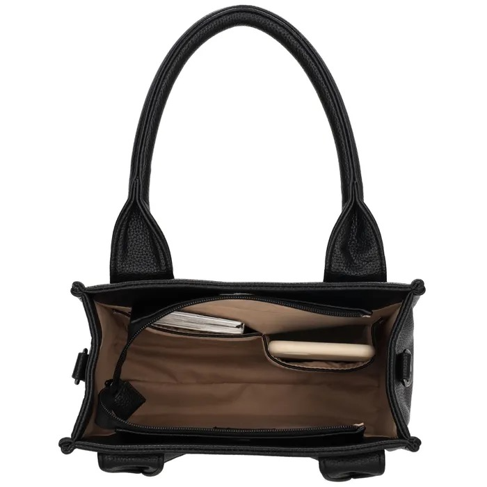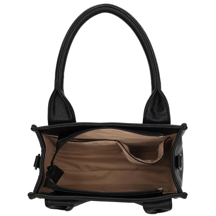 De Charm London Bond handtas in zwart is een stijlvolle en praktische tas voor dagelijks gebruik. Met een compact formaat van 26 x 21 x 13 cm biedt deze tas voldoende ruimte voor je belangrijkste spullen. Gemaakt van hoogwaardig imitatieleder en voorzien van een ritssluiting, combineert deze handtas een luxe uitstraling met gebruiksgemak. Dankzij de afneembare en verstelbare schouderband draag je de tas zowel in de hand als comfortabel over de schouder.