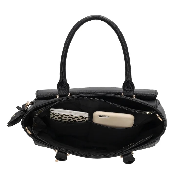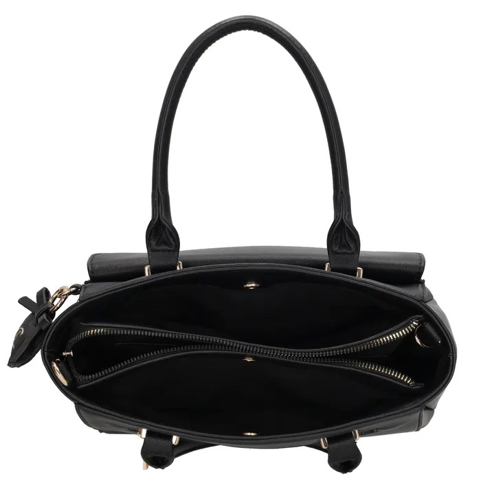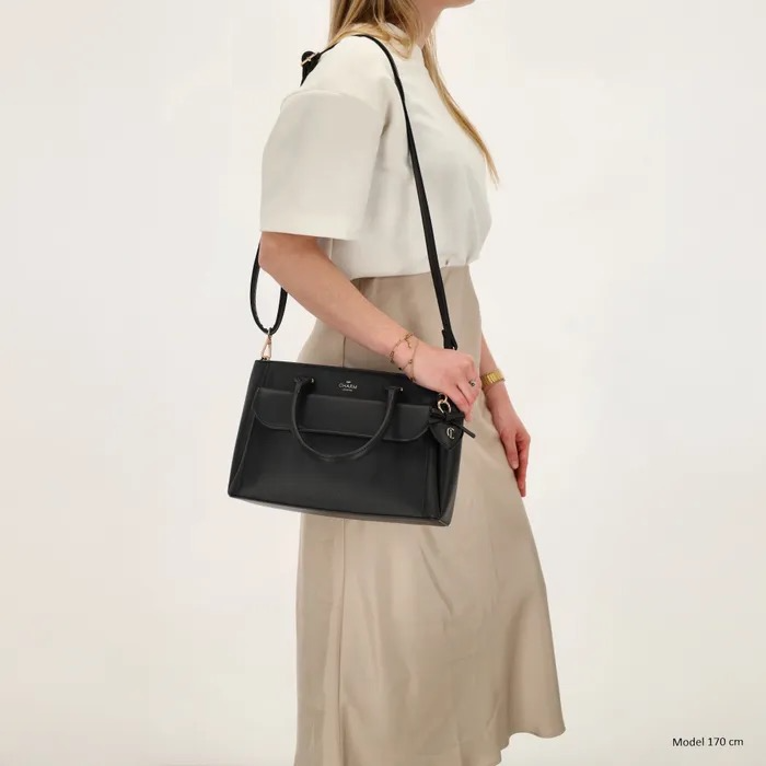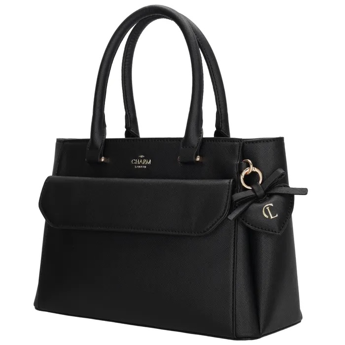 De Charm London Cambridge handtas in zwart is een stijlvolle en veelzijdige tas voor dagelijks gebruik. Met een compact formaat van 30 x 21 x 12 cm biedt deze tas voldoende ruimte voor je essentials. Gemaakt van hoogwaardig imitatieleder en voorzien van een ritssluiting, combineert deze handtas een luxe uitstraling met praktisch gemak. Dankzij de afneembare en verstelbare schouderband draag je de tas zowel in de hand als over de schouder.