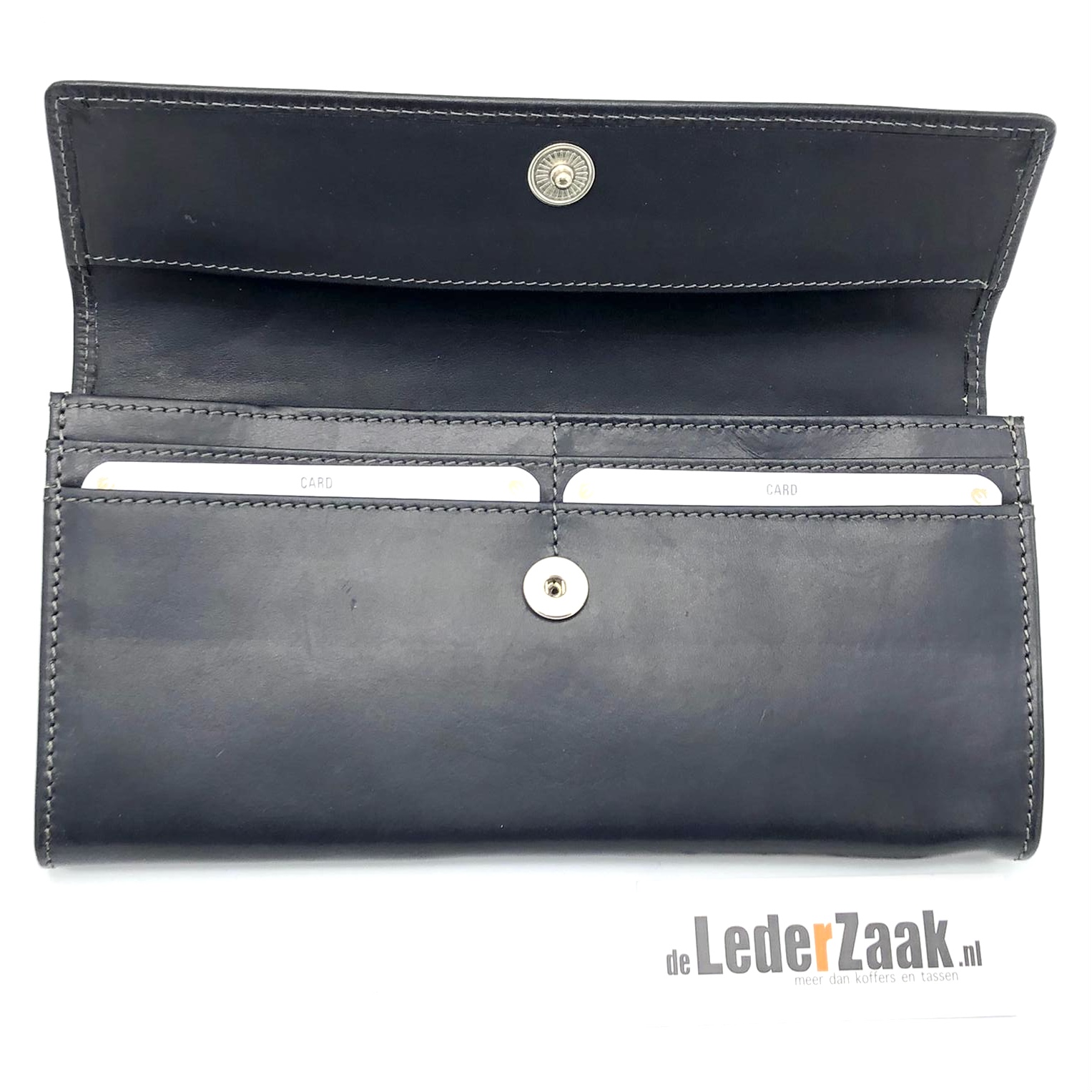 Deze portemonnee bied ruimte aan 13 pasjes en heeft 3 vakken voor bankbiljetten, een muntvak met rits voorzien van winkelwagenmunt. Overslag met drukknoop.