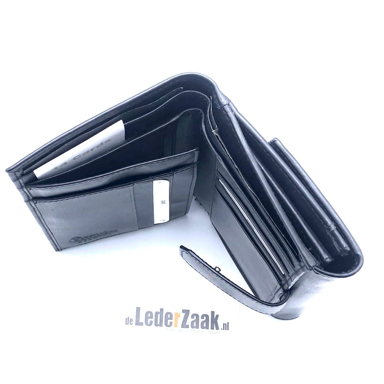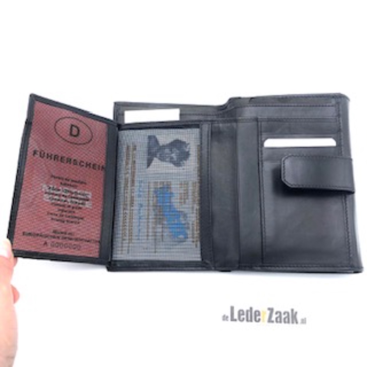 Deze portemonnee bied ruimte aan 14 pasjes, is voorzien van 2 vensters en heeft 2 vakken voor bankbiljetten. Deze kant van de portemonnee is af te sluiten door middel van een dubbele drukknoop. Hierdoor is dit gedeelte altijd af te sluiten, ook als deze vol is.