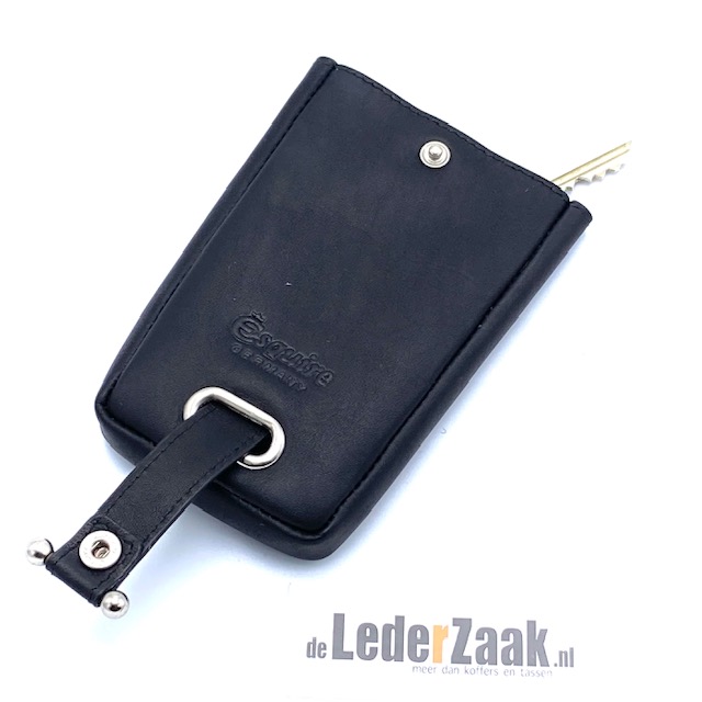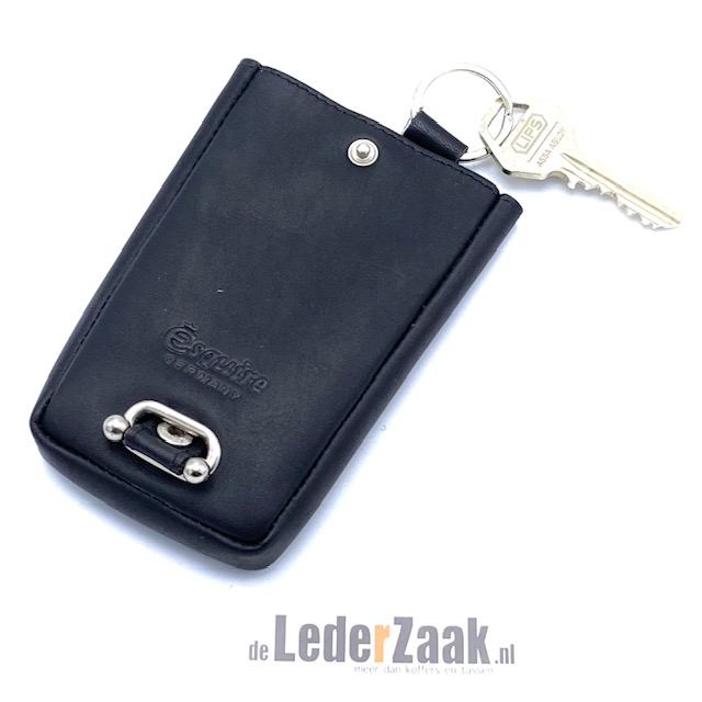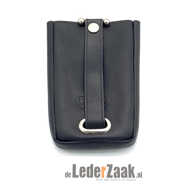 Zwart lederen sleuteletui voorzien van lederen koord met ring waaraan de sleutels gehangen kunnen worden.
