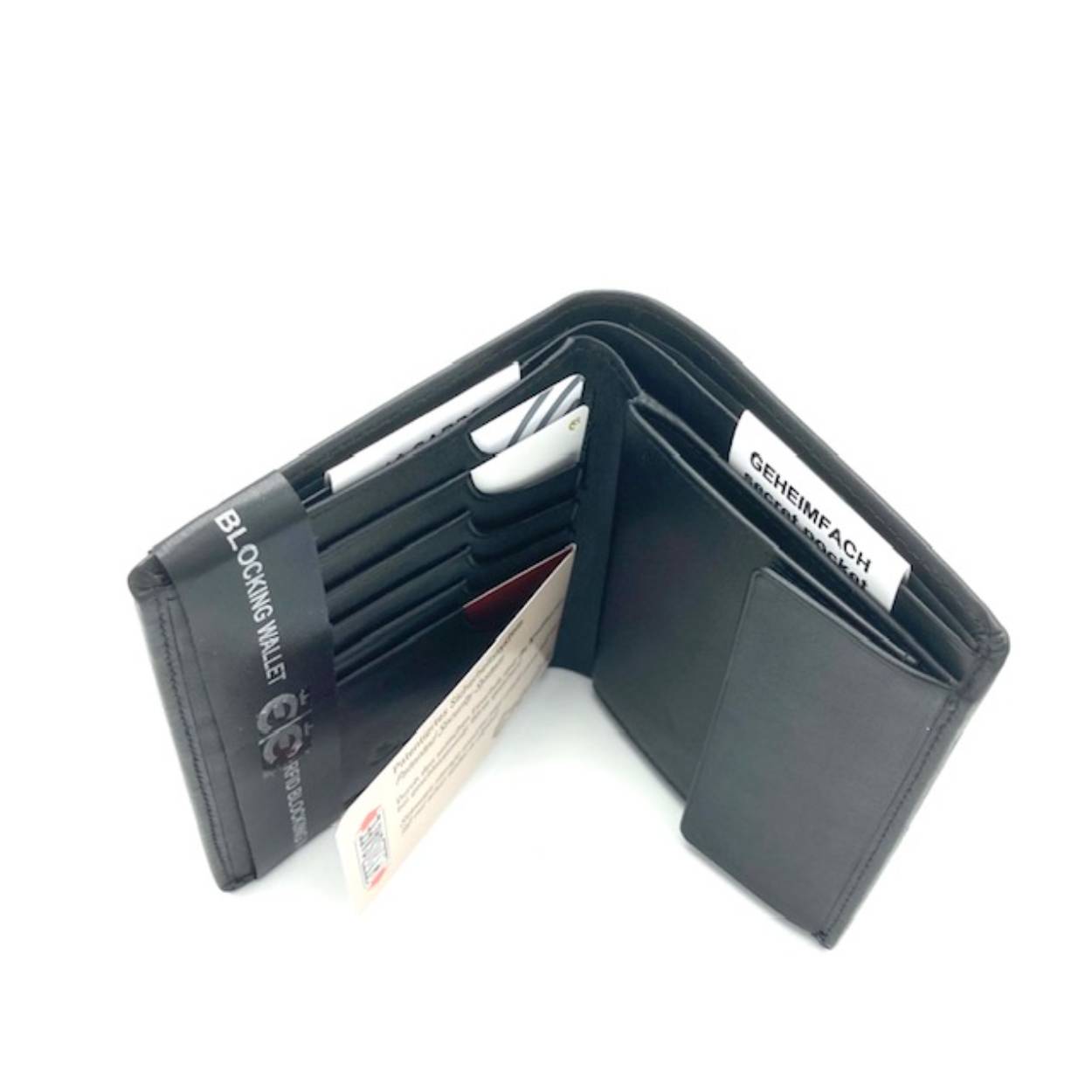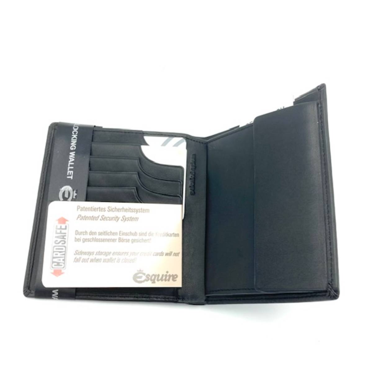 Mat lederen portemonnee waarin 10 pasjes in het totaal zijn op te bergen. Waarvan 6 pasjes door middel van card safe system. Een patent van Esquire. Dit voorkomt onnodig verliezen van uw kaarten. Tevens is de portemonnee voorzien van dubbel papiergeldzak en 1 geheimvak. Vanzelfsprekend is er ook ruimte voor veel muntjes.