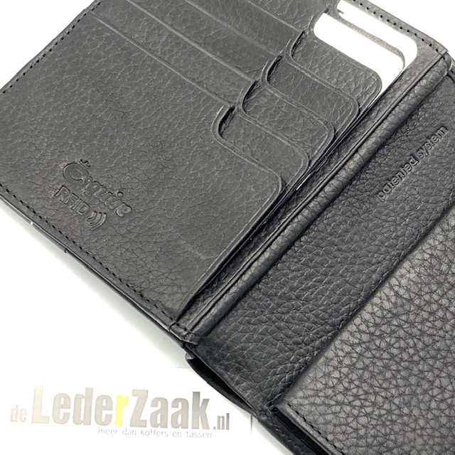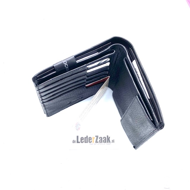 Hij heeft een CARD-SAFE systeem (hierdoor vallen de pasjes er niet uit), is voorzien van een venster, heeft RFID folie in het leer verwerkt, daardoor zijn uw gegevens veilig en de portemonee heeft 2 vakken voor bankbiljetten.