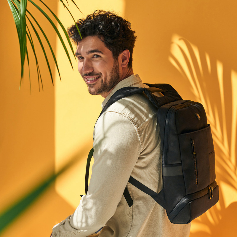 Ruime en functionele uitbreidbare rugzak geschikt voor laptops van 15,6 inch tot 17,3 inch. Deze rugzak is gemaakt van recycled plastic en waterafstotend materiaal, ideaal voor dagelijks gebruik en reizen.