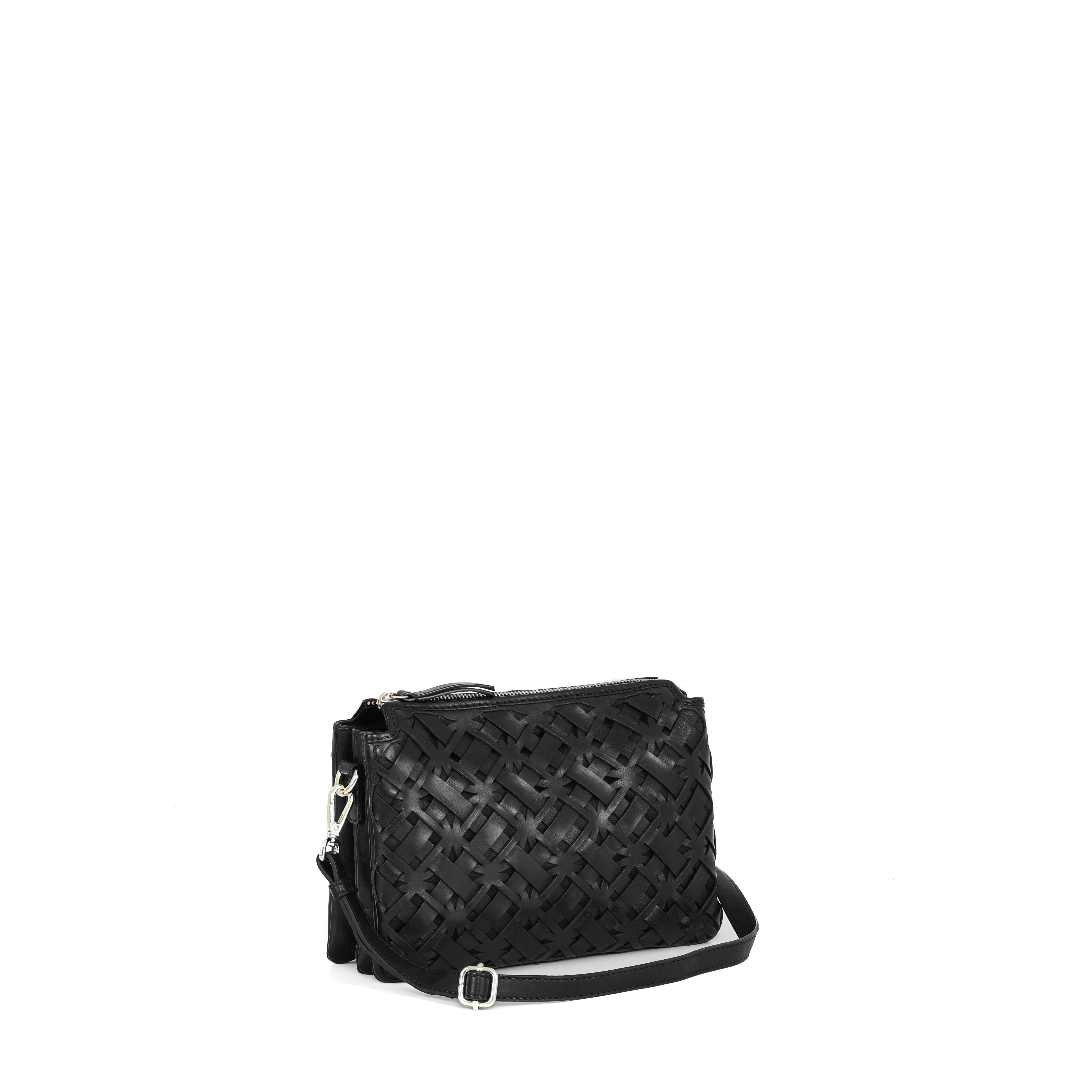 Deze stijlvolle cognac drievakstas heeft een elegante gevlochten voorzijde, wat de tas een luxe en tijdloze uitstraling geeft. De achterzijde is egaal uitgevoerd en voorzien van een praktisch ritsvak, ideaal voor spullen die je snel bij de hand wilt hebben.