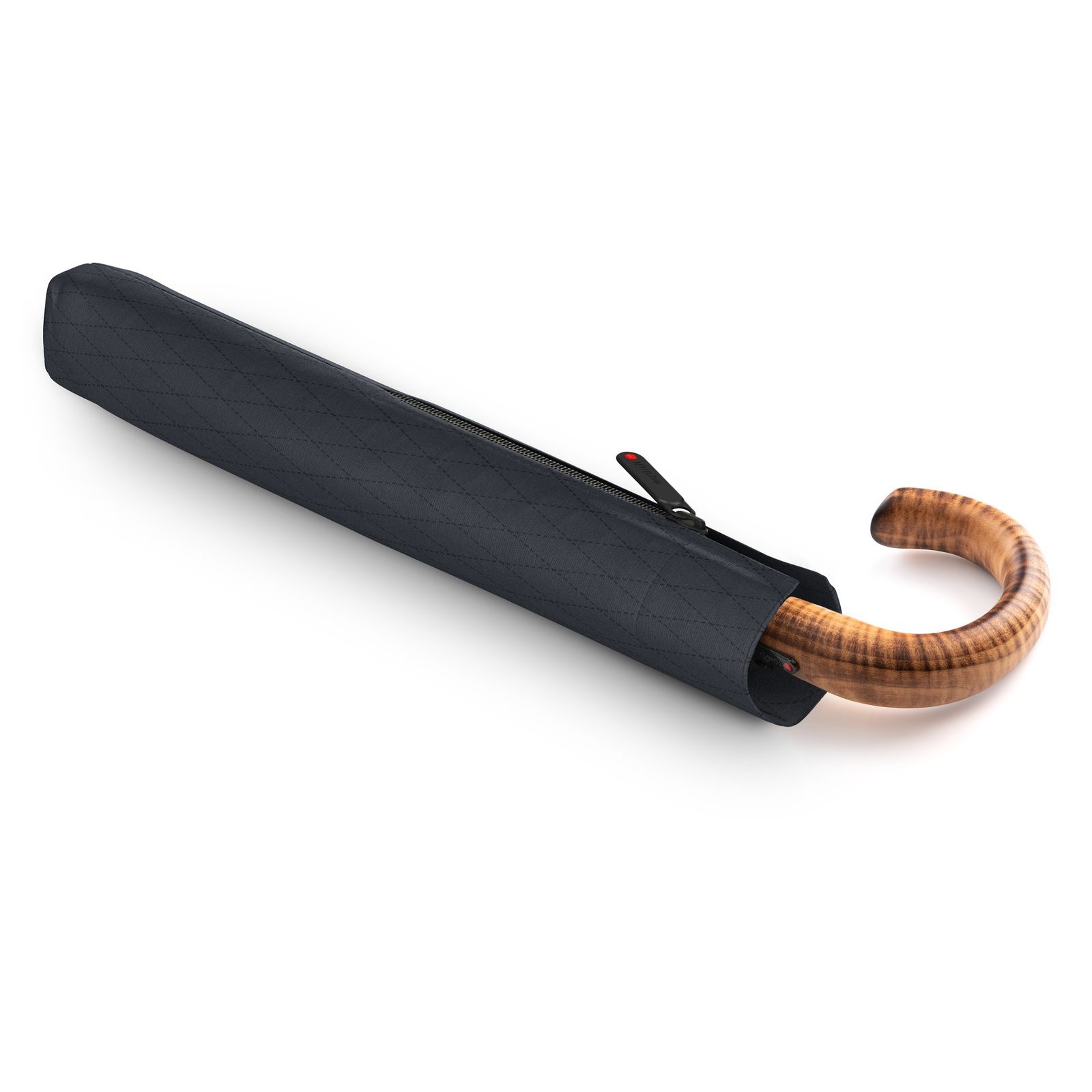 Deze automatische herenparaplu is uitgerust met stalen baleinen voor optimale stevigheid, een massief houten handgreep die comfortabel in de hand ligt, en koperen nieten die zorgen voor duurzame verbindingen – tot in de kleinste details is deze paraplu gebouwd om lang mee te gaan.