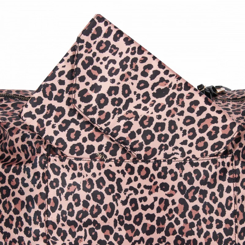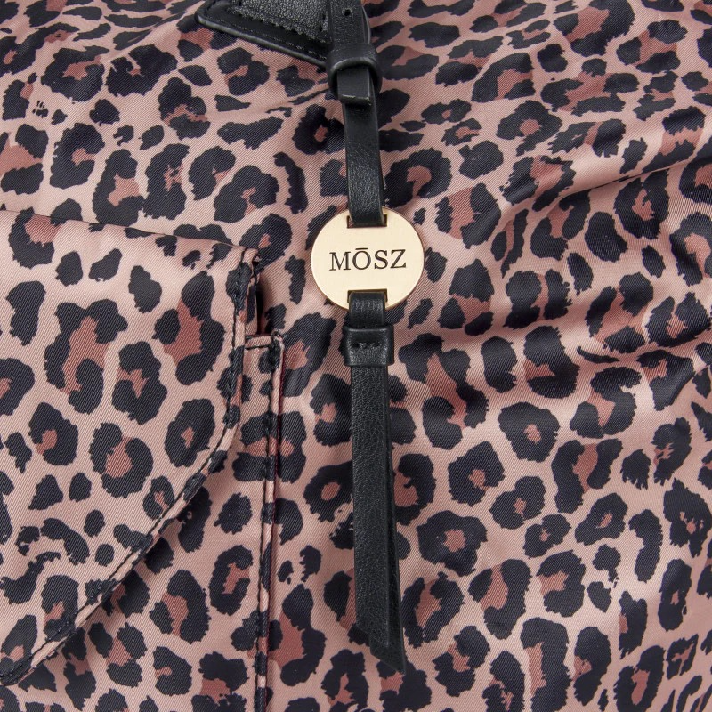 De Sandy reistas in panterprint van MŌSZ is de perfecte combinatie van functionaliteit en fashion. Gemaakt van hoogwaardig nylon met een subtiele glans en afgewerkt met matte gouden details – zoals de luxe ritsen en de elegante logohanger – straalt deze tas pure elegantie uit, met een speelse touch.