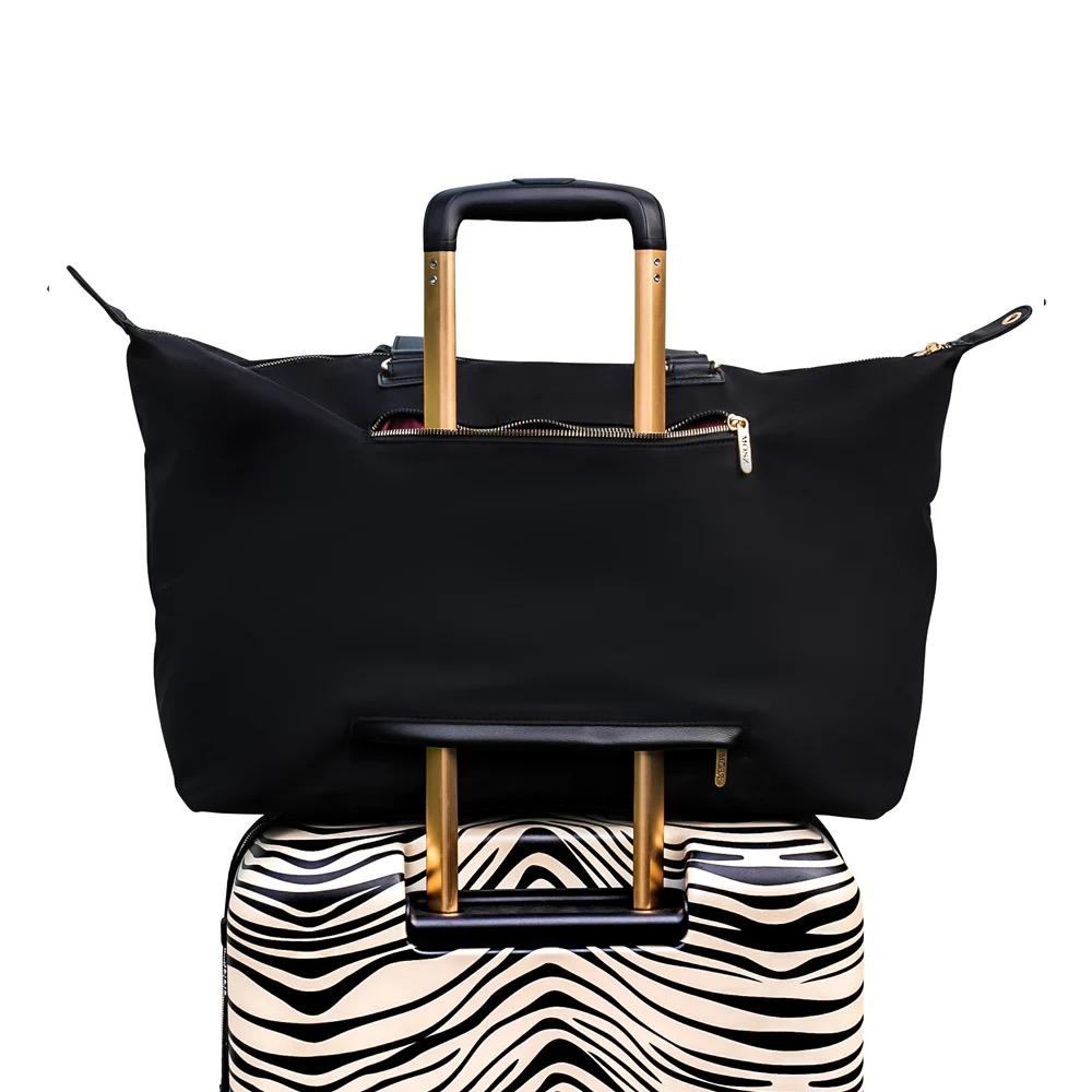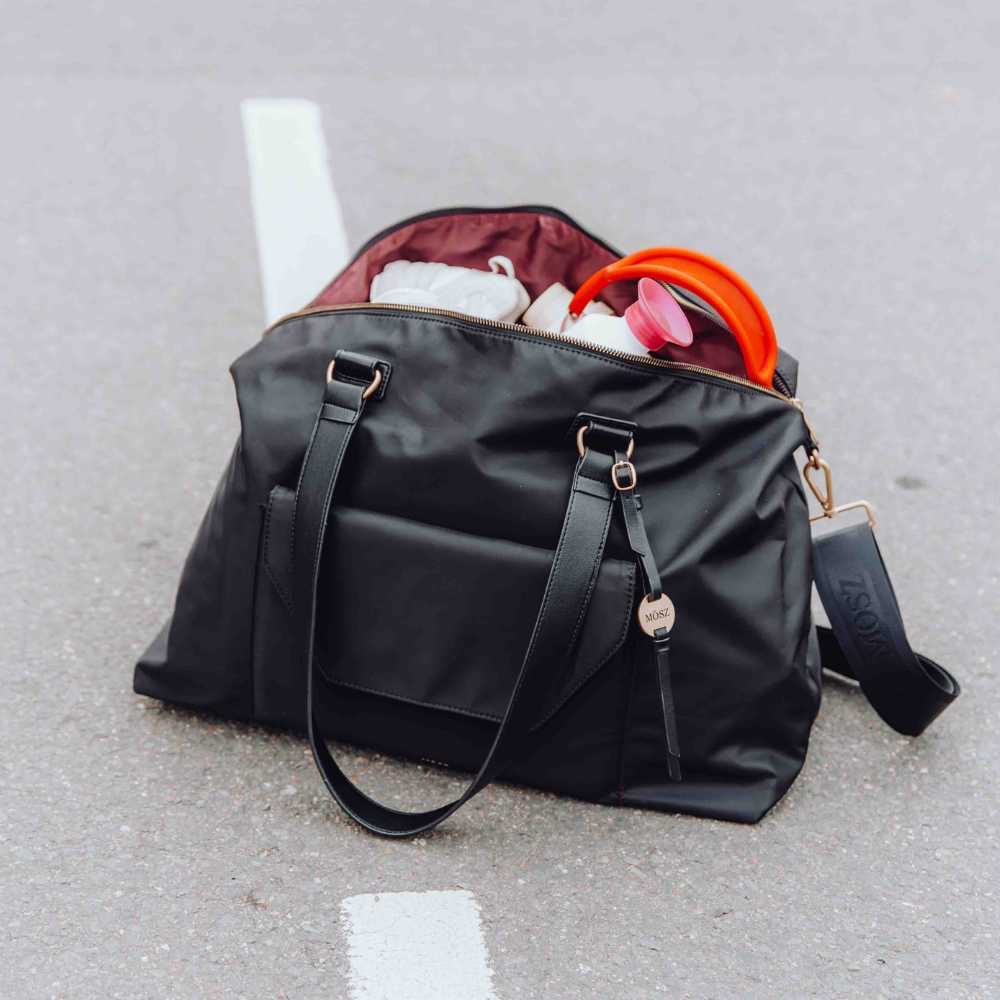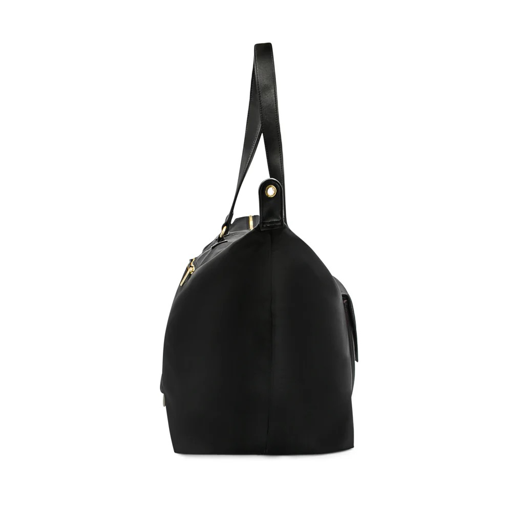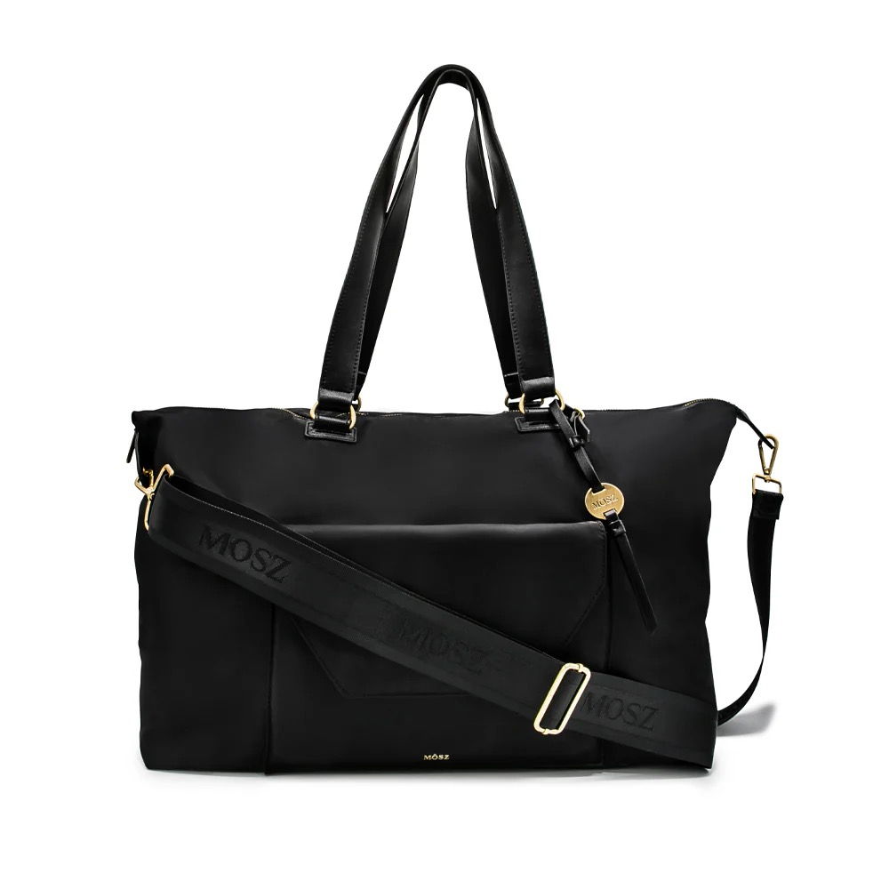 De Sandy reistas in Zwart Uni van MŌSZ combineert tijdloze elegantie met ultieme functionaliteit. Gemaakt van hoogwaardig nylon met een subtiele glans en afgewerkt met matte gouden details zoals ritsen en logohanger, straalt deze tas luxe uit en past hij bij iedere outfit.