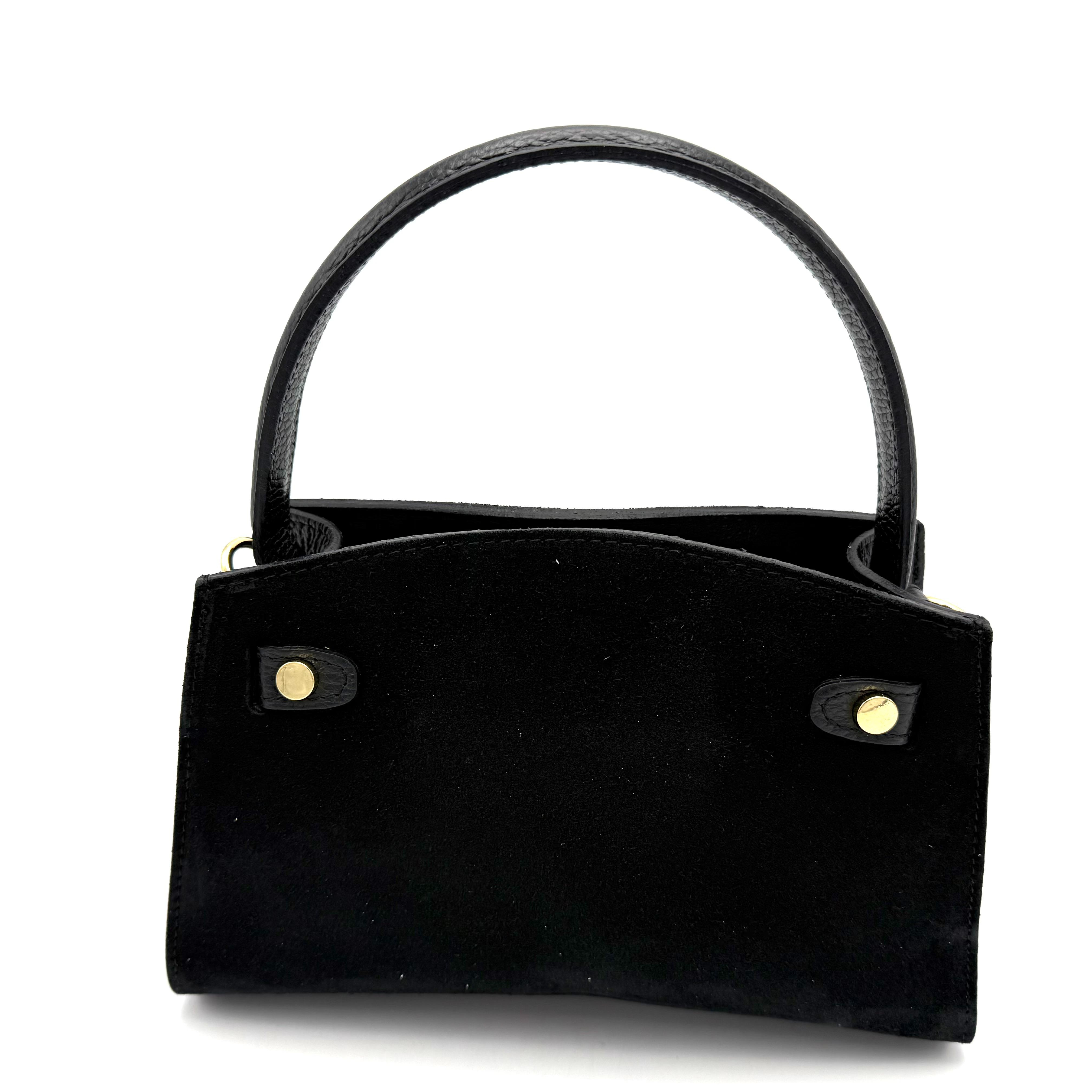 Ontdek pure elegantie met deze Italiaanse handtas van soepel dollaro leer, verfijnd afgewerkt met een luxueuze suède handgreep. Compact, stijlvol en praktisch – de ideale tas voor elke dag of een avond uit.