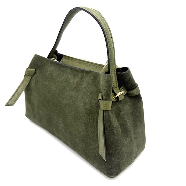 Deze stijlvolle suède handtas is een must-have voor elke modebewuste vrouw. Gemaakt in Italië en afgewerkt met luxe goudkleurige fournituren, straalt deze tas elegantie en klasse uit. De tas is compact maar praktisch, en biedt precies genoeg ruimte voor je dagelijkse essentials.