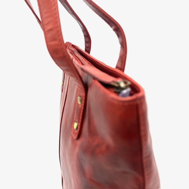Deze felrode tas heeft een stijlvol ontwerp met bronskleurige accenten en een handige ritssluiting. Het heeft een ruim hoofdvak en een compact binnenvak met rits. Daarnaast twee handige steekvakken voor bv uw telefoon in op te bergen.Draag deze tas kort op uw schouder voor een trendy look. Perfect voor elke gelegenheid!