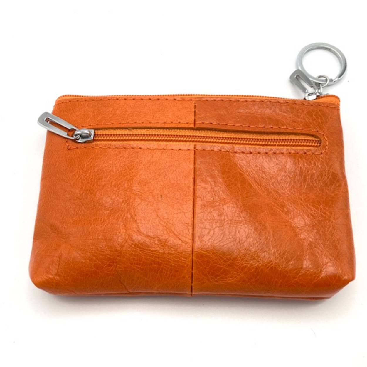 Lederen sleuteletui voorzien van voor en achterrits . Onder de toprits zit een ketting met ring en vakje voor pasjes.