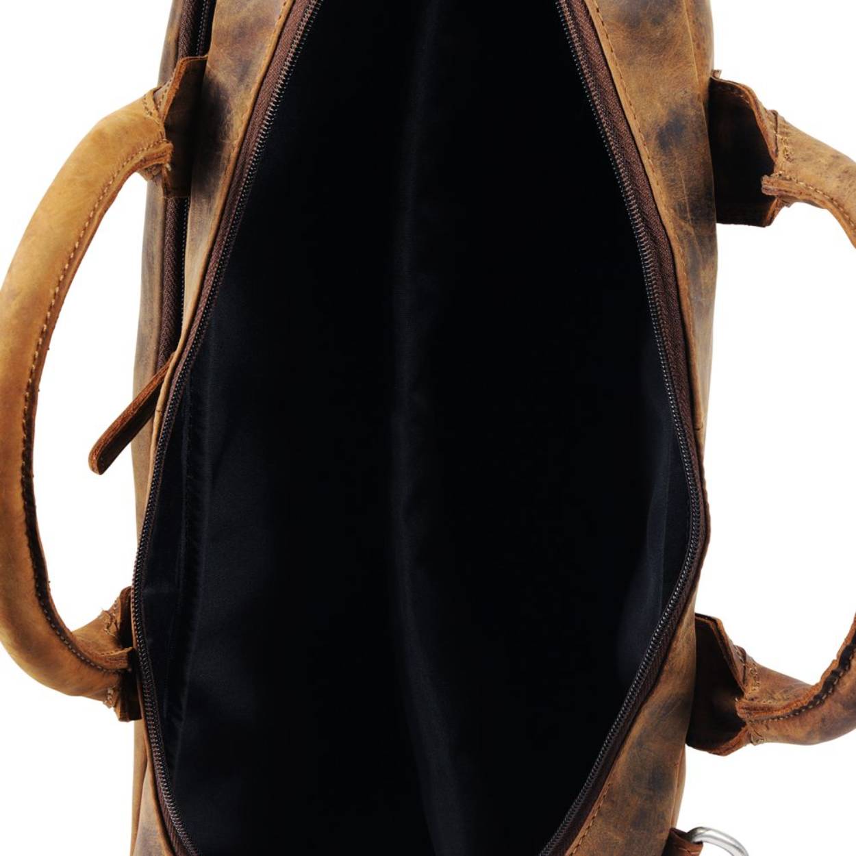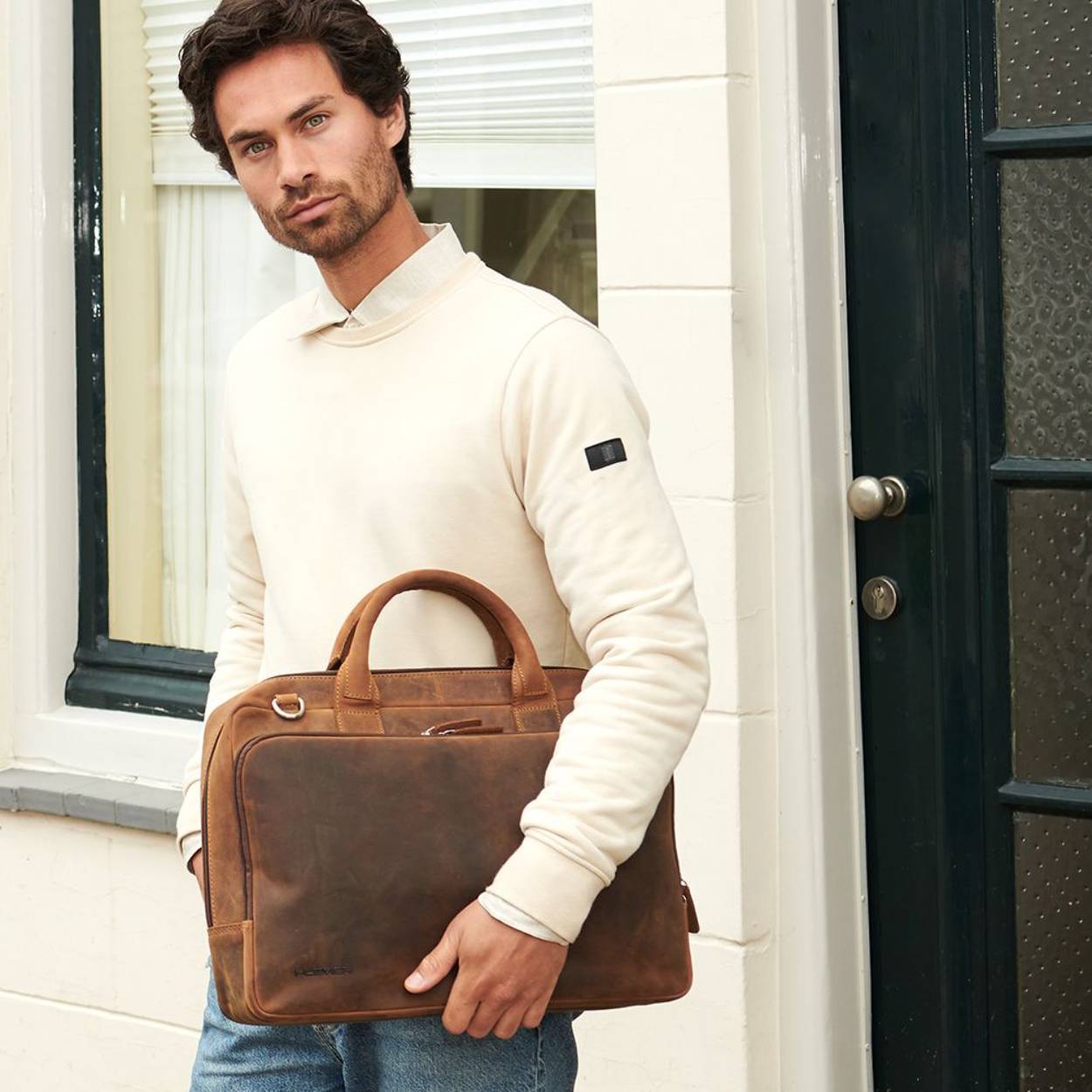 Deze businesstas is gemaakt van stevig plantaardig gelooid rundleer en heeft een vintage look. De tas heeft in totaal 1 hoofdvak met daarin een gepolsterd laptopvak voor een 15.6 inch laptop en een organizer voorvak met twee stretchvakken voor een muis/adapter en bekabeling. Een schouderband met een comfortabele schouderpad wordt meegeleverd.