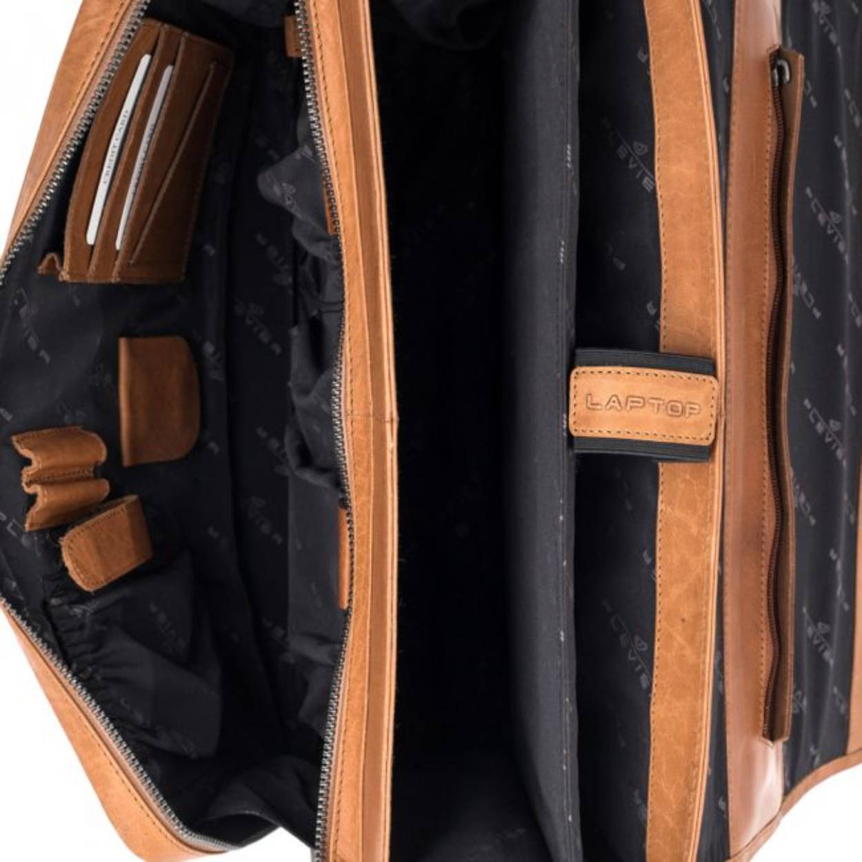 Deze aktetas is gemaakt uit volnerf plantaardig gelooid gewaxt leer en heeft 1 hoofdvak en een organizer voorvak met rits. In het hoofdvak is een gepolsterd afsluitbaar gedeelte voor een 15-15.6 inch laptop aangebracht. De tas is voorzien van Plevier® multifunctional pockets voor mobiele telefoon, usb stick, visitekaartjes, pennen, optische muis, adapter, bekabeling en een leren afneembare Plevier® sleutelhanger. Aan de achterkant zit een mogelijkheid om de tas op een trolley te schuiven. Een schouderband met een comfortabele schouderpad wordt meegeleverd.