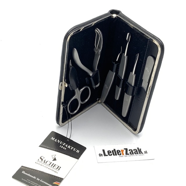 Manicureset 6 delig met hoogwaardig stalen o.a. pincet, vijl en schaartje. Buitenkant is van 100% glad leer. Beugel sluiting										14 x 8 x 2