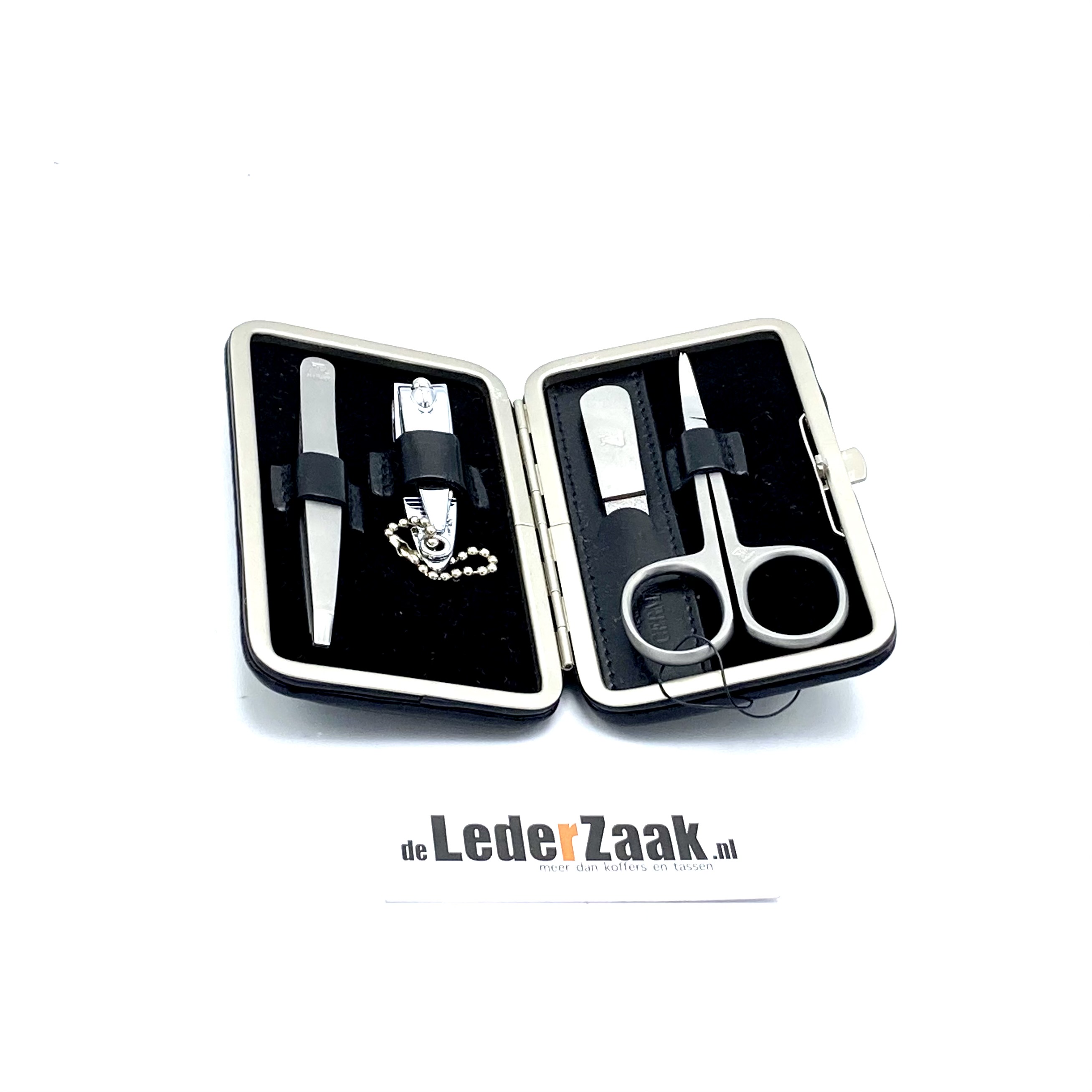 Manicureset 4 delig met hoogwaardig stalen knippertje, pincet, vijl en schaartje. Buitenkant is van 100% glad leer. Beugel sluiting										Afmeting: 11 x 7 x 1.5cm
