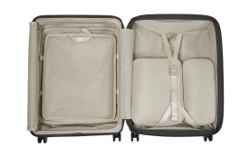 De koffer is praktisch ingericht met een vast en los tussenschot, een waterbestendig vak, packing cubes, een laptopvak en diverse opbergmogelijkheden. Extra handig zijn het voorvak voor snelle toegang en de ingebouwde AirTag-houder.
