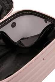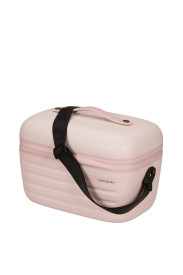 Handige beauty case met schouderband. Ideaal voor op vakantie, door middel van een band achterop kan het over het handvat van een koffer worden geschoven. Ook met handige vakjes om al het kwetsbare veilig op te bergen.