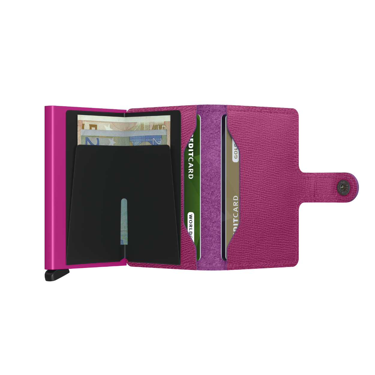 Met de Secrid cardprotector als basis, is de Miniwallet een compacte én veilige portemonnee. De portemonnee sluit af door middel van een drukknoopsluiting. De aluminium cardprotector in de Miniwallet beschermt uw belangrijkste passen optimaal, zowel tegen buigen, slijten en breken als tegen ongewenst uitlezen van RFID-kaarten (zoals de OV-chipkaart, ID-kaart, de nieuwste creditcards en bedrijfspasjes). De Secrid Miniwallet is geschikt voor 6 vlakke kaarten of 4 kaarten met verdikte letters. Naast zes kaarten in de cardprotector biedt het binnenwerk ruimte voor enkele kaarten, papiergeld, bonnetjes en visitekaartjes. De Secrid Miniwallet is een compacte portemonnee en vanwege de druksluiting gemakkelijk mee te nemen. Dankzij het unieke ontwerp schuiven de kaarten trapsgewijs naar buiten voor een eenvoudige selectie. De Secrid Miniwallet wordt geleverd in een mooie verpakking en daardoor ook zeer geschikt als uniek cadeau. Crisple variant: gecorrigeerd leer en is hierdoor gemakkelijk te onderhouden. - Vervaardigd uit echt Europees leer - Sluit af met een drukknoopsluiting - Protector gemaakt van massief aluminium - Formaat slechts 21 mm dik - Ruimte voor 6 vlakke kaarten of 4 kaarten met verdikte letters (bepaalde creditcards) - Extra ruimte voor briefgeld, visitekaartjes, garantiebonnen of 4 extra passen - Geschikt voor enkele munten - Beschermt kaarten tegen buigen, slijten, breken en ongewenst uitlezen (skimmen) - Met één druk op de knop schuiven de kaarten trapsgewijs naar buiten 2 jaar garantie