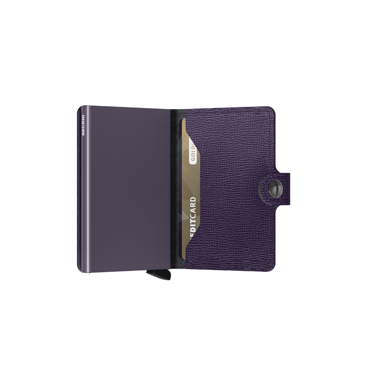 Met de Secrid cardprotector als basis, is de Miniwallet een compacte én veilige portemonnee. De portemonnee sluit af door middel van een drukknoopsluiting. De aluminium cardprotector in de Miniwallet beschermt uw belangrijkste passen optimaal, zowel tegen buigen, slijten en breken als tegen ongewenst uitlezen van RFID-kaarten (zoals de OV-chipkaart, ID-kaart, de nieuwste creditcards en bedrijfspasjes). De Secrid Miniwallet is geschikt voor 6 vlakke kaarten of 4 kaarten met verdikte letters. Naast zes kaarten in de cardprotector biedt het binnenwerk ruimte voor enkele kaarten, papiergeld, bonnetjes en visitekaartjes. De Secrid Miniwallet is een compacte portemonnee en vanwege de druksluiting gemakkelijk mee te nemen. Dankzij het unieke ontwerp schuiven de kaarten trapsgewijs naar buiten voor een eenvoudige selectie. De Secrid Miniwallet wordt geleverd in een mooie verpakking en daardoor ook zeer geschikt als uniek cadeau. Crisple variant: gecorrigeerd leer en hierdoor gemakkelijk te onderhouden. - Vervaardigd uit echt Europees leer - Sluit af met een drukknoopsluiting - Protector gemaakt van massief aluminium - Formaat slechts 21 mm dik - Ruimte voor 6 vlakke kaarten of 4 kaarten met verdikte letters (bepaalde creditcards) - Extra ruimte voor briefgeld, visitekaartjes, garantiebonnen of 4 extra passen - Geschikt voor enkele munten - Beschermt kaarten tegen buigen, slijten, breken en ongewenst uitlezen (skimmen) - Met één druk op de knop schuiven de kaarten trapsgewijs naar buiten 2 jaar garantie
