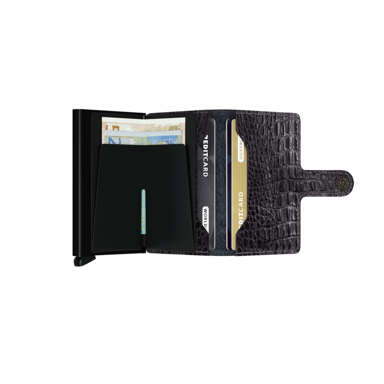 De Miniwallet Nile Blue is hoogwaardig kroko, gemaakt van runderhuiden. De diepe tinten worden bereikt met de speciale tamponato-techniek en de hoogglans waslaag.