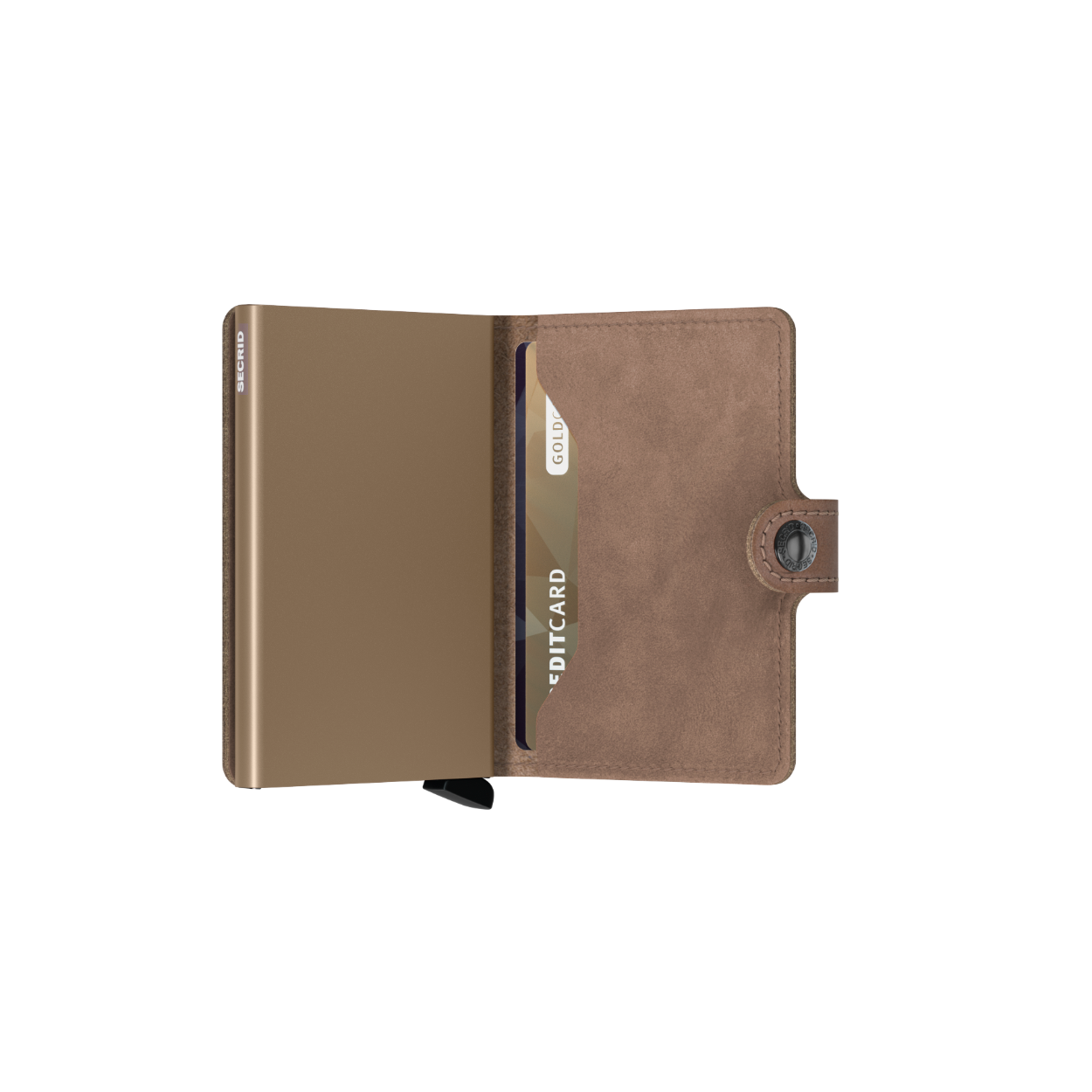Het gepatenteerde mechanisme zorgt ervoor dat je met één simpele beweging direct toegang hebt tot je kaarten. De aluminium behuizing, uitgevoerd in een elegante vintage taupe finish, beschermt jouw kaarten tegen buigen, breken en ongewenste draadloze communicatie (RFID-skimming).