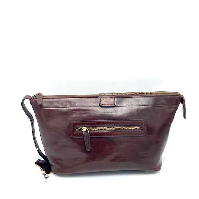 Toilettas met aan de achterzijde een rits, handgreep en 3 elastische banden. De afmeting is17 x 28 x 14. De tas is gemaakt van een 100% Italiaans volnerf leer.